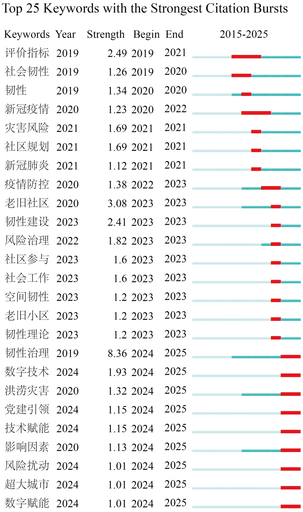 本部分与“CiteSpace关键词时间线谱图分析”部分均选取“发文量分析”部分中检索到的1659篇文献与本研究相关度较高的500篇文献进行了CiteSpace分析。从图2基于CiteSpace工具对“社区韧性”领域文献的关键词突现分析图可知,国内学者在2015~2025年从多维度解析该领域研究焦点变迁与前沿动态。在突现强度上,2024~2025年“韧性治理”以8.36的最高突现强度成为核心前沿议题,反映研究向治理实践路径转向,此外“老旧社区”(3.08,2023年)“评价指标”(2.49,2019~2021年)等中高强度关键词,分别凸显老旧社区作为重点实践场景、早期对韧性量化评估的理论探索需求,而“风险治理”“社区参与”等中低强度关键词则体现研究向微观实践要素延伸;从时间阶段看,2015~2019年为萌芽探索期,以“评价指标”“社会韧性”突现为标志,聚焦概念迁移与理论框架搭建;2020~2023年进入实践聚焦期,“新冠疫情”“疫情防控”推动研究转向公共卫生危机应对,“灾害风险”“社区规划”拓展风险场景,2023年“老旧社区”“韧性建设”集中突现形成“场景–目标–措施”研究链条;2024~2025年步入创新深化期,“数字技术”“技术赋能”体现技术赋能趋势,“党建引领”凸显基层治理特色,“超大城市”“风险扰动”聚焦复杂场景与动态韧性维系;整体而言,研究呈现从“理论建构”向“实践创新”、从“危机响应”向“常态治理”、从“单一维度”向“多元整合”(技术 + 主体 + 场景 + 目标)的三大趋势,且与我国基层治理实际深度结合,本土化特征显著。