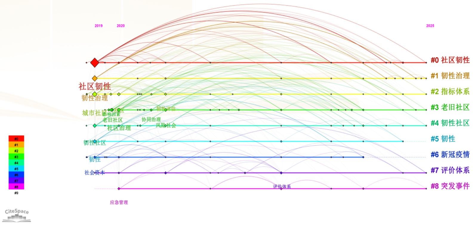 图3呈现了2015~2025年“社区韧性”相关研究领域的动态演进。从聚类角度看,时间线谱图通过8个核心聚类,直观呈现了研究从基础理论建构到场景化实践、再到危机响应与治理深化的完整演进路径。早期(2015~2019年)聚类以“社区韧性”“韧性”为核心,同步关联“指标体系”“评价体系”,聚焦“韧性”核心概念界定与量化评估框架搭建,构成领域研究的基础理论支柱;2020年后,“新冠疫情”“突发事件”聚类的出现与扩散,打破了早期单一理论聚类格局,与“社区韧性”“韧性社区”形成交叉关联,推动研究重心向“突发事件应急管理”倾斜;2023~2025年,“韧性治理”“老旧社区”聚类的凸显的同时,与“协同治理”等关键词深度绑定,标志着研究从“危机响应”转向“常态治理深化”,形成以“韧性治理”为核心、“老旧社区”为典型场景、“协同治理”为关键路径的实践导向聚类体系,而各聚类间的持续关联则反映出领域研究并非孤立推进,而是围绕“社区韧性”核心,实现了基础理论、危机应对、场景实践、治理创新的系统性整合与动态深化。