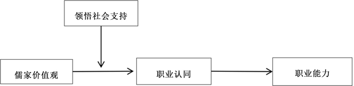 为探究传统文化对辅导员职业能力影响的内在作用机制,本文引入职业认同变量,通过构建“价值观–认同–能力”的中介链条,揭示职业认同的桥梁作用。个体职业认同感的高低会影响其学习和提升职业能力的意愿,而文化氛围会不断塑造辅导员对职业的认同感。此外,本文引入领悟社会支持作为调节变量,为理解文化因素对职业认同的影响提供了新的理论解释。图1为本文的研究模型图。