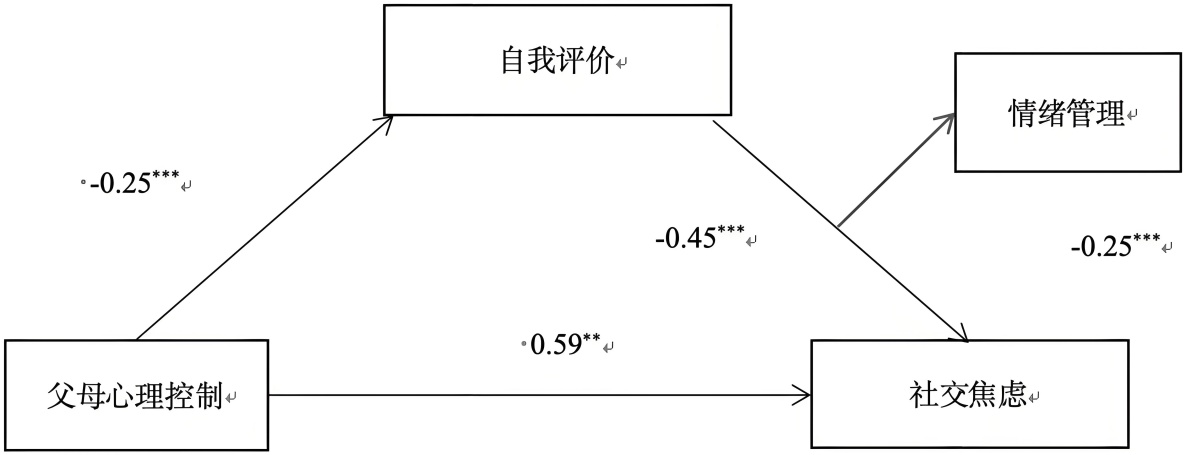 在父母心理控制与社交焦虑之间,自我评价起到了重要的中介作用。研究表明,父母心理控制通过降低子女的自我评价,间接导致其社交焦虑的增加。这一发现与现有的心理学研究结果相一致(Judge et al., 1997),自我评价被视为个体在面对社会环境时调节情绪和行为的重要心理机制。