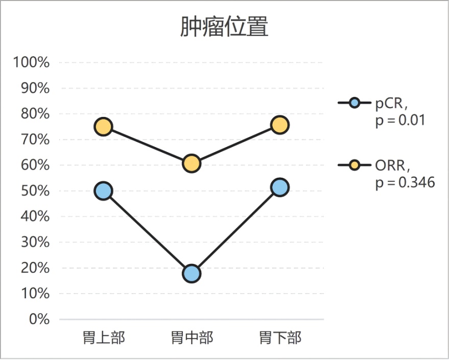 同时,位于胃上部(贲门、胃底)及下部(胃窦)的肿瘤在接受介入栓塞化疗后,相较于胃中部(胃体)肿瘤,显示出更高的pCR率。这可能与胃的解剖结构和供血特点有关:胃中部的肿瘤不受贲门和幽门的限制,且有多支动脉(如胃左动脉、胃右动脉等)交汇供血,从而导致介入栓塞化疗的效果降低。