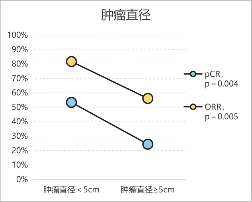 根据美国癌症联合委员会(AJCC)第8版分类,在基线(临床恶性肿瘤TNM分类:cTNM)和手术后(新辅助后恶性肿瘤病理TNM分类:ypTNM)进行肿瘤分期。根据RECIST (Response Evaluation criteria In Solid Tumors) 1.1标准[10]进行疗效评估:完全缓解(CR),所有靶病变消失;部分缓解(PR),目标病变的直径总和至少减少30%;疾病进展(PD),目标病变直径总和增加至少20%或出现一个或多个新病变;疾病稳定(SD),既没有足够的缩小以符合PR,也没有足够的增加以符合PD;以CR + PR计算客观有效率(ORR)。