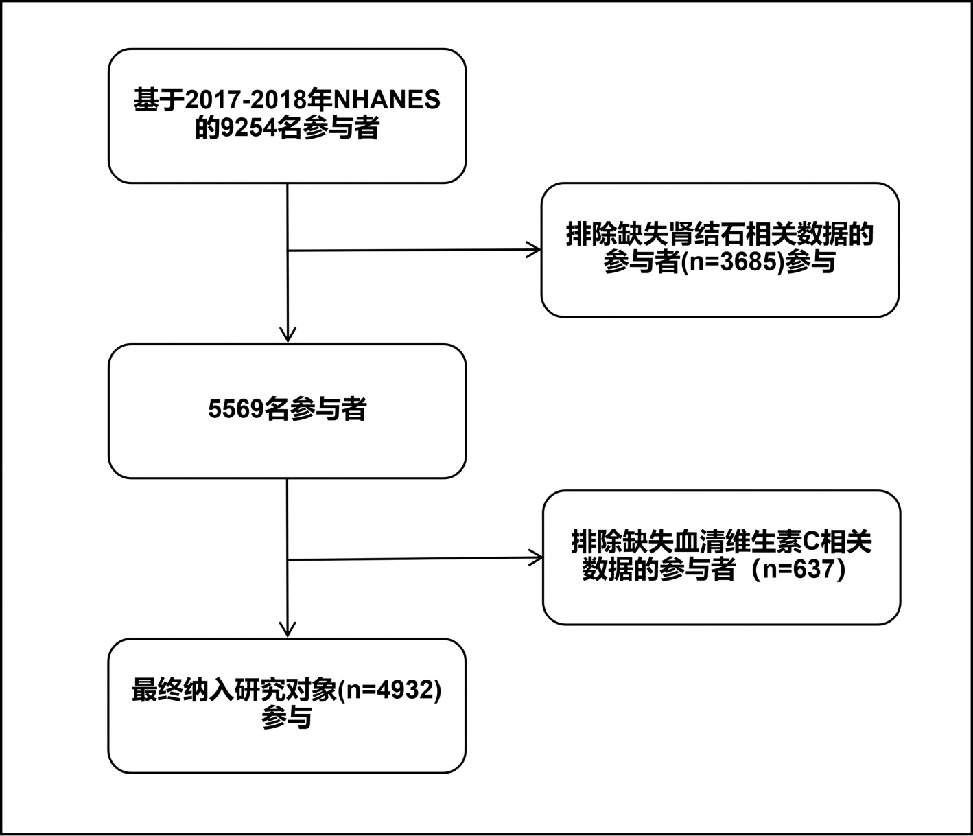 NHANES是国家卫生统计中心(NCHS)进行的一项重要调查项目,旨在评估美国人口的健康状况和营养状况。该项目已获得NCHS伦理审查委员会的批准,所有参与者均签署了知情同意书。项目涵盖了广泛的人口统计数据、体格检查、实验室测试、与健康相关的问卷和处方药清单。所有数据均可以在CDC官方https://www.cdc.gov/nchs/nhanes/上获取。我们获取2017~2018年全国健康和营养检查调查(NHANES)的数据,并使用R软件4.1和EmpowerStats 4.0对下载的数据进行可视化和分析。我们的研究共有9254名参与者接受了调查,在排除缺少肾结石数据(n = 3685)和缺少血清维生素C数据(n = 637)后,我们的最终分析包括4932名参与者(图1)。