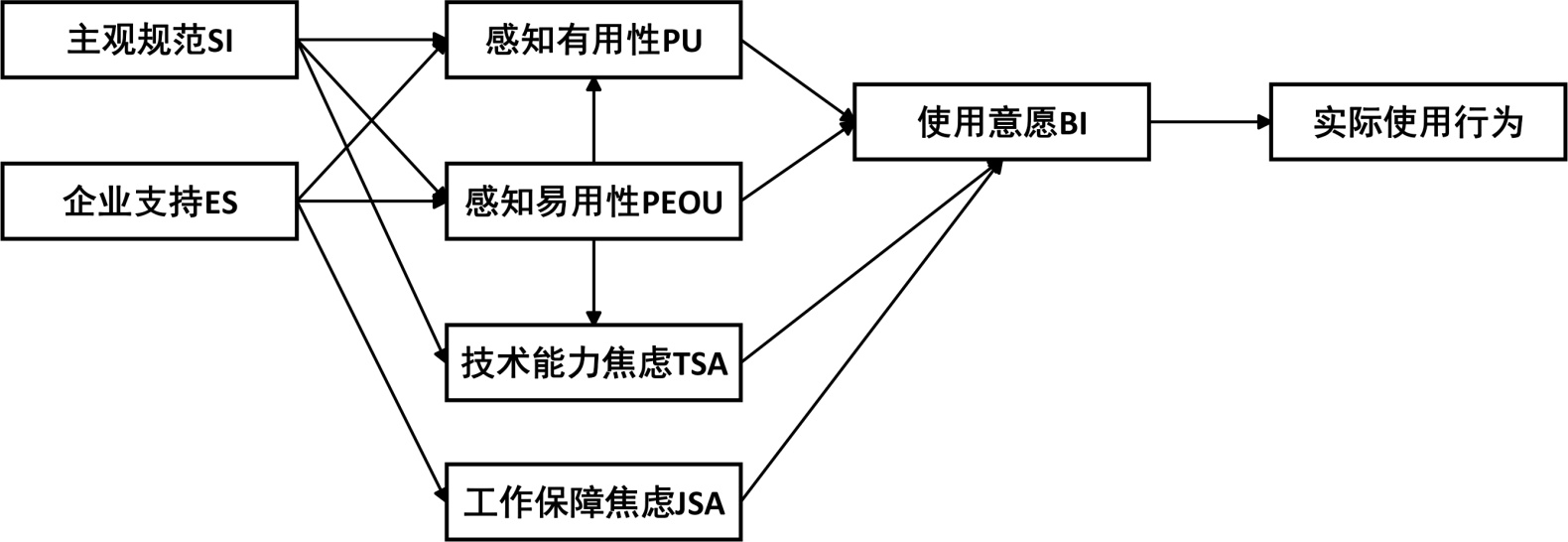 H1:感知有用性(PU)对企业员工使用AI数字员工的意愿(BI)具有显著的正向影响。