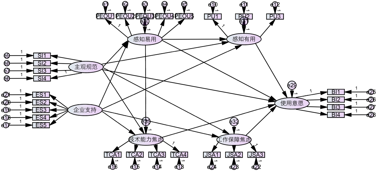 问卷主体对所有潜变量(感知有用性、感知易用性、工作保障焦虑、技术能力焦虑、主观规范、企业支持及使用意愿)均采用反射性测量模型。题项主要源于成熟量表,并结合AI数字员工的自主性、交互性及替代效应等具体情境进行了针对性改编。