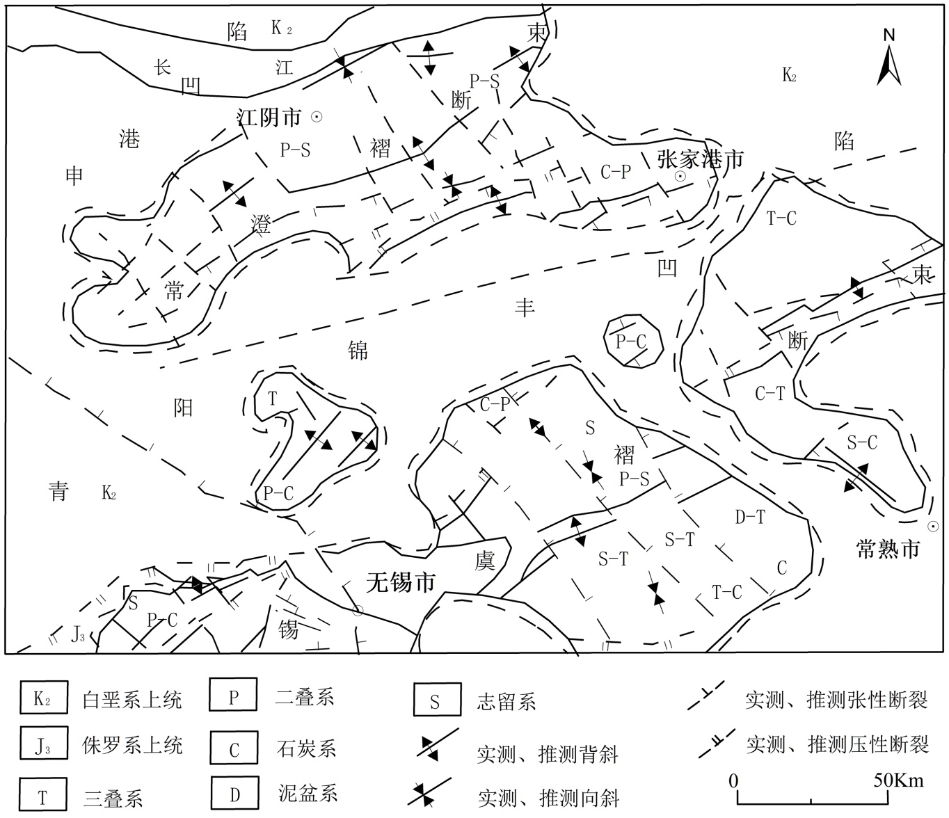 根据褶皱、断层及其组合特征和中、新生代沉积构造展布等,研究区可划分为申港凹陷、常澄褶断束、青阳–锦丰凹陷、锡虞褶断束四个整体呈北东走向的构造单元,形成“二隆二凹”型构造格局(如图1)。其中常澄褶断束和锡虞褶断束由一系列北东的褶皱组成基本轮廓,并伴有大量走向断层。其中背斜的核部多出露地表,形成区内众多北东向的山丘,是区内崩塌灾害的主要发育地带。