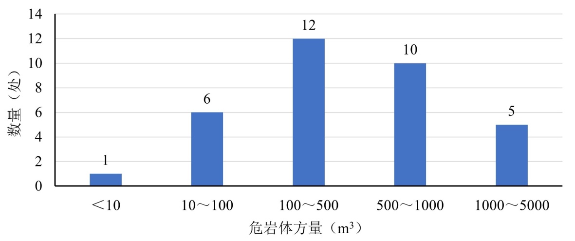 发育规模是地质灾害风险评价的基础,也是分析地貌演化过程的关键参数[11]。研究区34处崩塌隐患点危岩体体积均小于10,000 m3,规模均为小型,具有规模小的特点。具体来看,危岩体方量主要集中在1000 m3以内,其中小于10 m3有1处,占总数的2.9%;10~100 m3有6处,占总数的17.6%;100~500 m3有12处,占总数的35.3%;500~1000 m3有10处,占总数的29.4%;1000~5000 m3有5处,占总数的14.7% (如图3)。