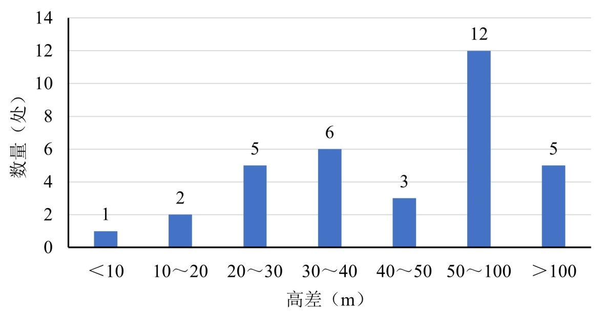 在其它条件都相同的情况下,边坡高差越大,重力势能越大,崩塌发生时的破坏性越强。研究区34处崩塌隐患点危岩体相对坡脚最大高差多小于100 m。具体来看,高差小于10 m有1处,占总数的2.9%;10~20 m有2处,占总数的5.9%;20~30 m有5处,占总数的14.7%;30~40 m有6处,占总数的17.6%;40~50 m有3处,占总数的8.8%;50~100 m有12处,占总数的35.3%;大于100 m有5处,占总数的14.7% (如图4)。研究区崩塌隐患主要由开山采石等人工切坡引发,所在微地形多为“L”形,且危岩体距坡脚相对高差较小,崩塌体崩落后多堆积于坡脚,基本不会形成滚石。