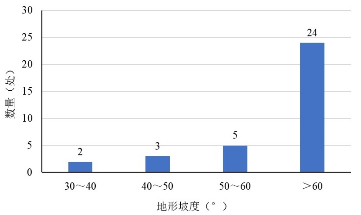 斜坡变形要具备良好的临空条件,斜坡坡度越大,其重力沿坡向提供的分量也就越大,滑动力越大。研究区34处崩塌隐患点均位于坡度大于30˚的陡坡及陡崖地带。具体来看,地形坡度30˚~40˚有2处,占总数的5.9%;40˚~50˚有3处,占总数的8.8%;50˚~60˚有5处,占总数的14.7%;大于60˚有24处,占总数的70.6% (如图5)。