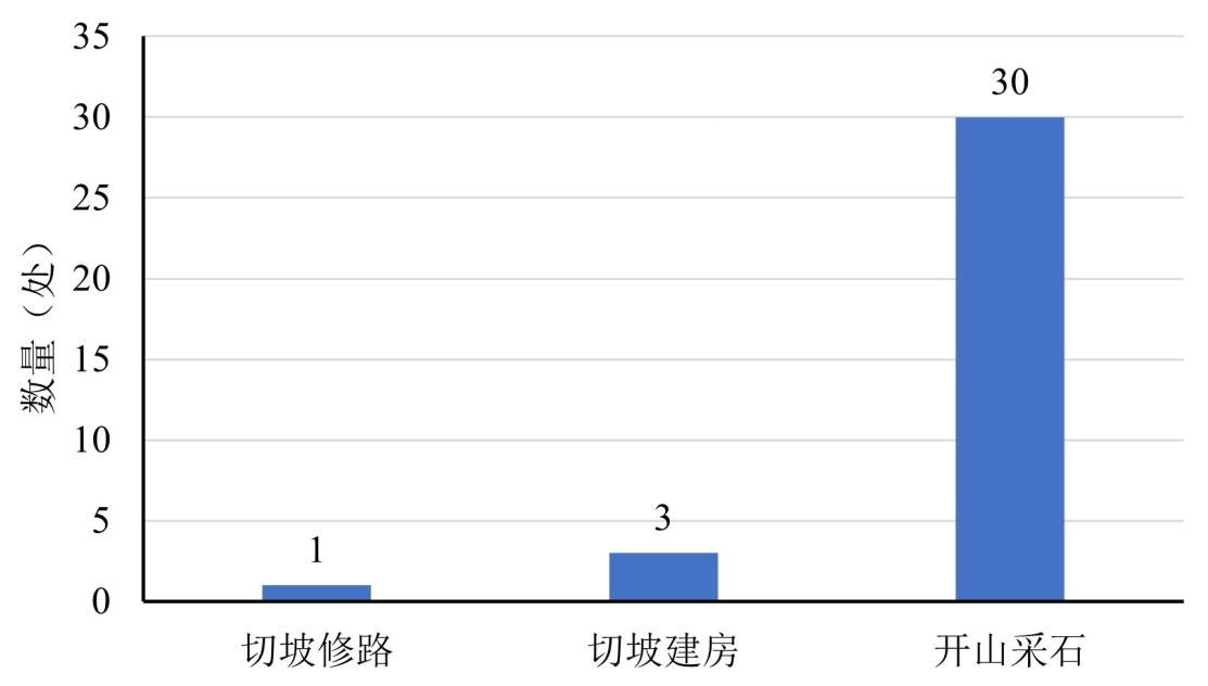研究区34处崩塌隐患点均由人工切坡引发,具体来看,有30处由开山采石引发,占总数的88.3%;2处由切坡建房引发,占总数的8.8%;1处由切坡修路引发,占总数的2.9% (如图6)。人工切坡形成高陡临空面,改变了斜坡的原始应力分布,加之开挖对斜坡岩土体进行了扰动,岩土体裂隙进一步发育,局部破碎,从而引发崩塌现象。
