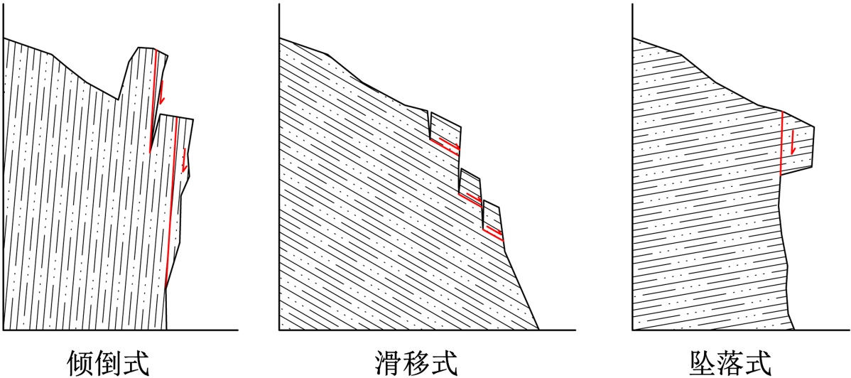 研究区崩塌均为岩质崩塌,主要发育于砂岩等坚硬岩组地层中,具有突发性和连发性的特点。由于岩体裂隙的出现、发展常不被人注意,崩塌的前兆不明显,因而突发性较强。崩塌发生后,又会出现新的陡峭临空面,在降雨、风化和重力作用下,新的裂缝延伸扩展,崩塌现象可再次发生,从而形成连发性的崩塌现象[13]。崩塌灾害的变形破坏模式主要受岩土体结构特征、主控结构面发育状况、地形这三方面因素的控制,在受力状态和运动形式上各有特点[14] [15]。工作区崩塌按成因机理主要为坠落式崩塌,其次为滑移式崩塌和倾倒式崩塌(如图7)。