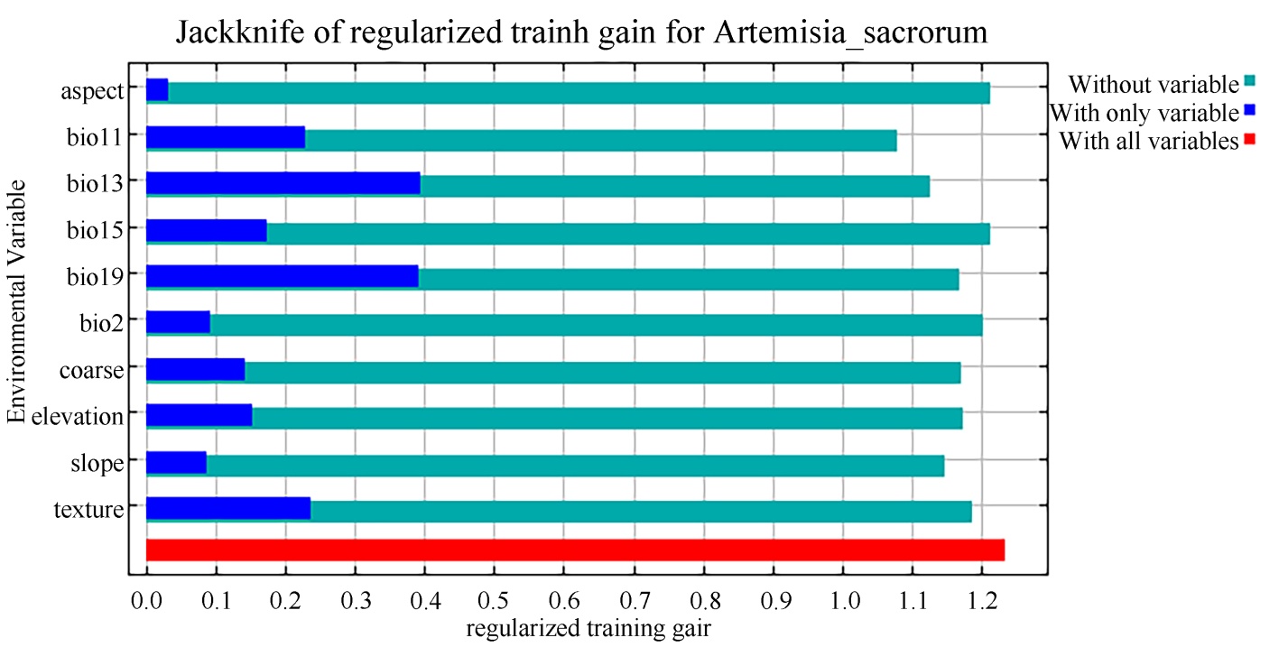 (2) 为探究不同环境因子对预测结果的影响程度,本研究采用刀切法(Jackknife)对影响物种分布的主要环境变量进行重要性(贡献率)评估。分析结果显示,在影响铁杆蒿适生区分布的环境因子中,bio11 (最冷季度平均温度/℃)、bio13 (最湿月份降水量/mm)、bio19 (最冷季度降水量/mm)以及elevation (海拔)具有决定性作用。但仍存在一定的局限性:仅聚焦气候、地形以及土壤因子,未纳入人类活动,如农业扩张、交通网络等变量,可能低估实际扩散潜力。未来研究可进一步整合人类活动、生物竞争等因子,扩大数据收集范围,优化模型预测精度。此外,深入解析铁杆蒿与本地植物的竞争机制及其对生物多样性的长期影响,将为生态修复提供理论支撑。