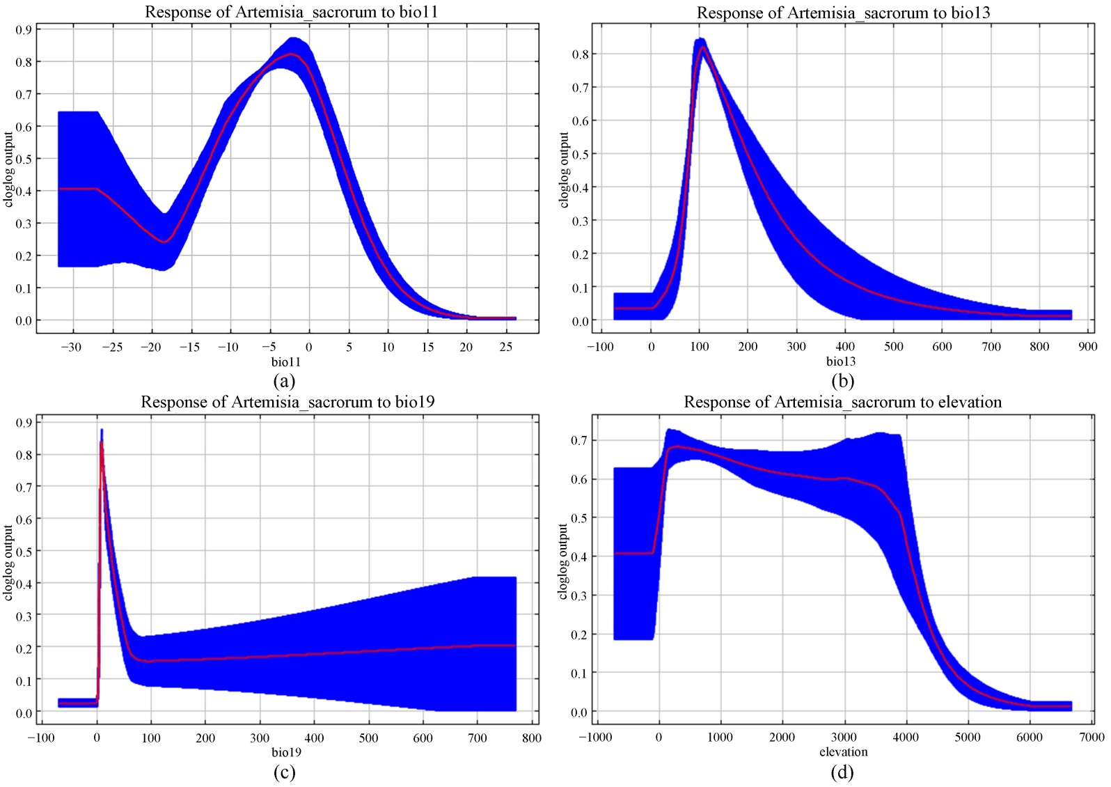 本研究中模型的ROC曲线下面积AUC值达0.913 (图3),且经重复运算后表现出良好的稳定性,表明铁杆蒿适生区的预测结果具备较高可靠性。基于模型运行结果,本研究采用刀切法(Jackknife)分析了影响铁杆蒿潜在地理分布的环境变量(图4),筛选出4个主导环境变量,分别为bio11 (最冷季度平均温度/℃)、bio13 (最湿月份降水量/mm)、bio19 (最冷季度降水量/mm)和elevation (海拔)。结合主导环境变量的响应曲线(图5)可知,铁杆蒿的最适生存环境为:最冷季度平均温度−12.68℃~3.92℃、最湿月份降水量15.9 mm~198.18 mm、最冷季度降水量6.44 mm~24.92 mm、海拔−15.77 m~3906.6 m。