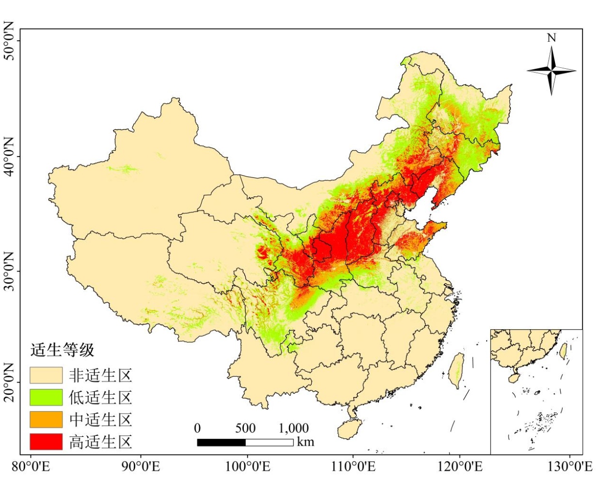 2,集中分布于东北部省份;随着时间推移,在2050 s时期,SSP126、SSP585气候模式下的适生区面积分别为2,772,723.32 km