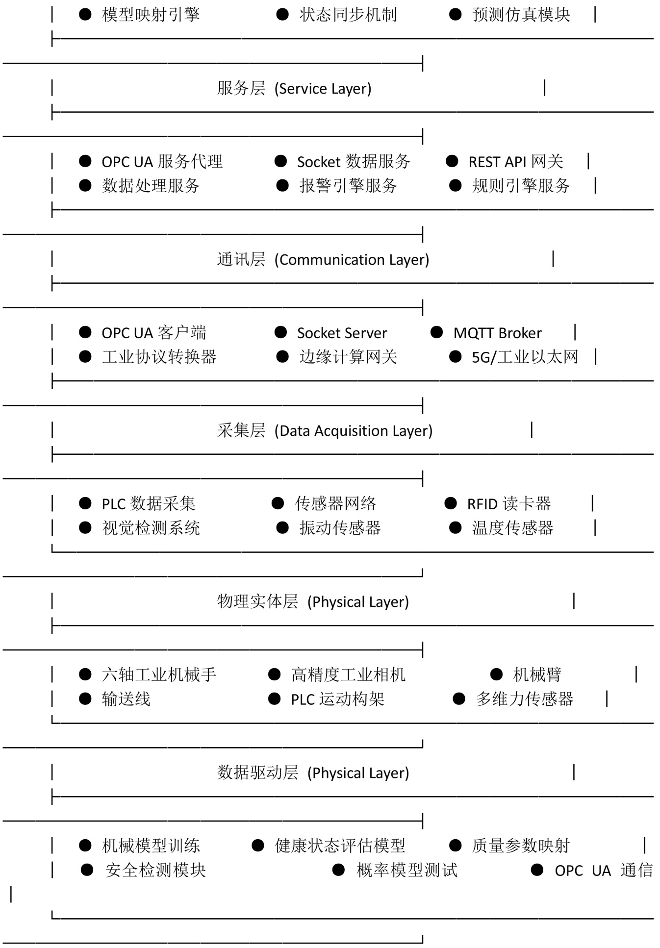 物理实体层包含解包线的全部硬件,六轴工业机械手、高精度工业相机、多维力传感器、PLC控制系统等,这些设备不断产生位置、速度、力度、温度等多维状态数据,为数字孪生模型提供实时数据源。