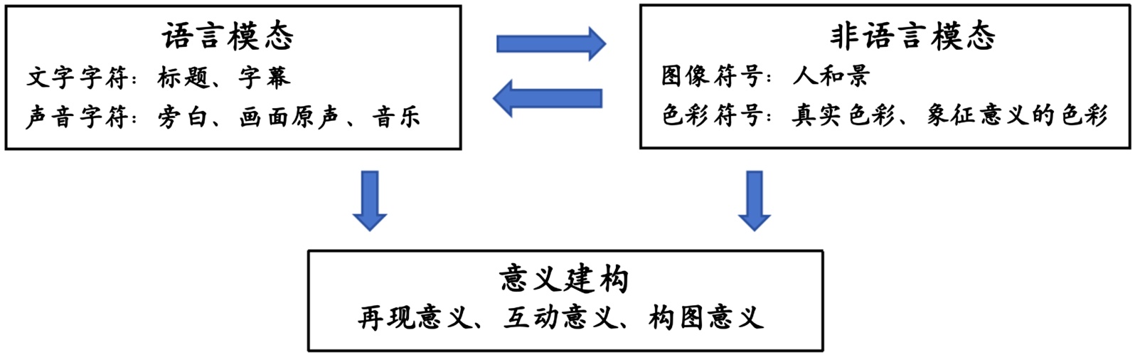 顾曰国认为,“模态”是人通过感官与外界的交互方式[1]。朱永生则将模态视为沟通的媒介,包含文字、影像、色彩、音乐等各种符号。使用单个感官进行交互的称为单模态,使用两个的称为双模式,将三种或多种感觉如听觉、视觉、触觉等多种感觉结合在一起,利用几种符号形式来产生和传递语义则叫多模态[2]。