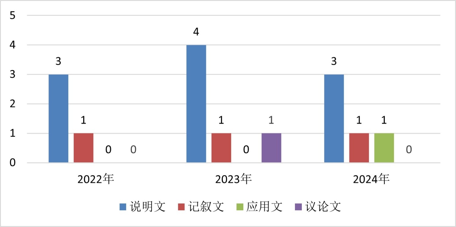 图中显示三年总计15篇语篇中,说明文7篇,记叙文5篇,应用文3篇,议论文0篇。近三年语篇体裁的量化分析显示,命题在语篇类型选择上呈现出明显的集中性与稳定性特征。从表5和图2可见,说明文(46.7%)与记叙文(33.3%)构成了绝对的主体,应用文(20.0%)作为补充,而新课标同样明确要求的议论文、新闻报道等类型则连续三年未出现。