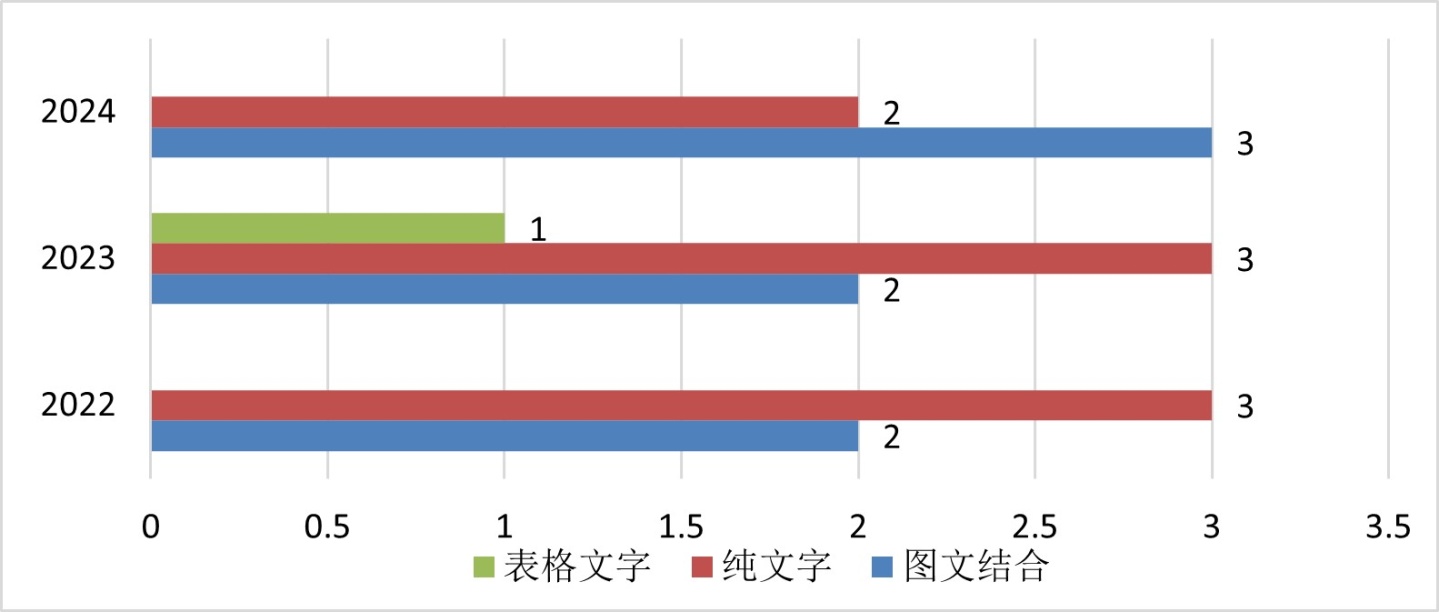 《义务教育英语课程标准(2022年版)》将“看”明确列为与听、说、读、写并列的语言技能,强调学生应能“理解多模态语篇中的图形、表格、动画、符号以及视频等视觉信息”(教育部,2022) [1]。这标志着测评理念从单一的文字解码转向对多元信息整合能力的考查。阅读理解语篇的呈现方式,是体现“看”技能测评意图最直接的载体。本研究将语篇呈现形式分为纯文字、图文结合及表格文字三类,并对2022~2024年的情况进行了统计(见图3)。