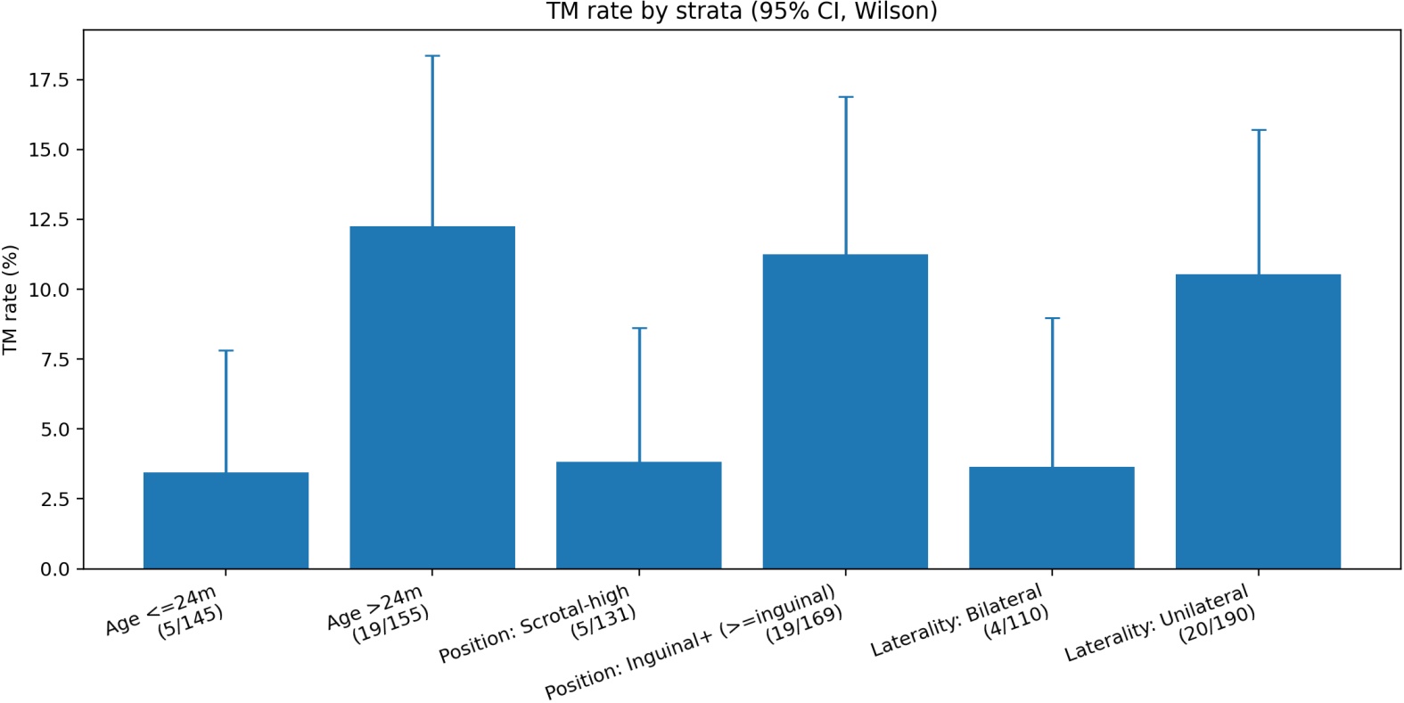 图1. 不同分层因素的TM发生率(Wilson 95%CI)