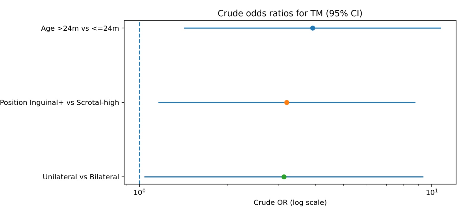 计数资料以例数(%)表示。比较不同分层变量与TM发生的关联,采用Pearson χ2检验;当列联表存在小样本或期望频数偏小时采用Fisher精确检验。效应量以比值比(OR)表示,并给出95%置信区间(95%CI)。检验水准α = 0.05,P < 0.05为差异有统计学意义。统计分析使用GraphPad Prism 9.0等软件完成。此外,考虑TM事件数较少(n = 24),在单因素分析基础上进一步建立包含“手术年龄(>24月龄vs ≤24月龄)”和“术前位置(腹股沟及以上vs阴囊上型)”的双变量Logistic回归模型,进行探索性校正分析,以初步评估两因素与TM发生的独立关联。由于纳入病例采用统一的开放性睾丸下降固定术路径,术式变量缺乏组间差异,未纳入回归模型。