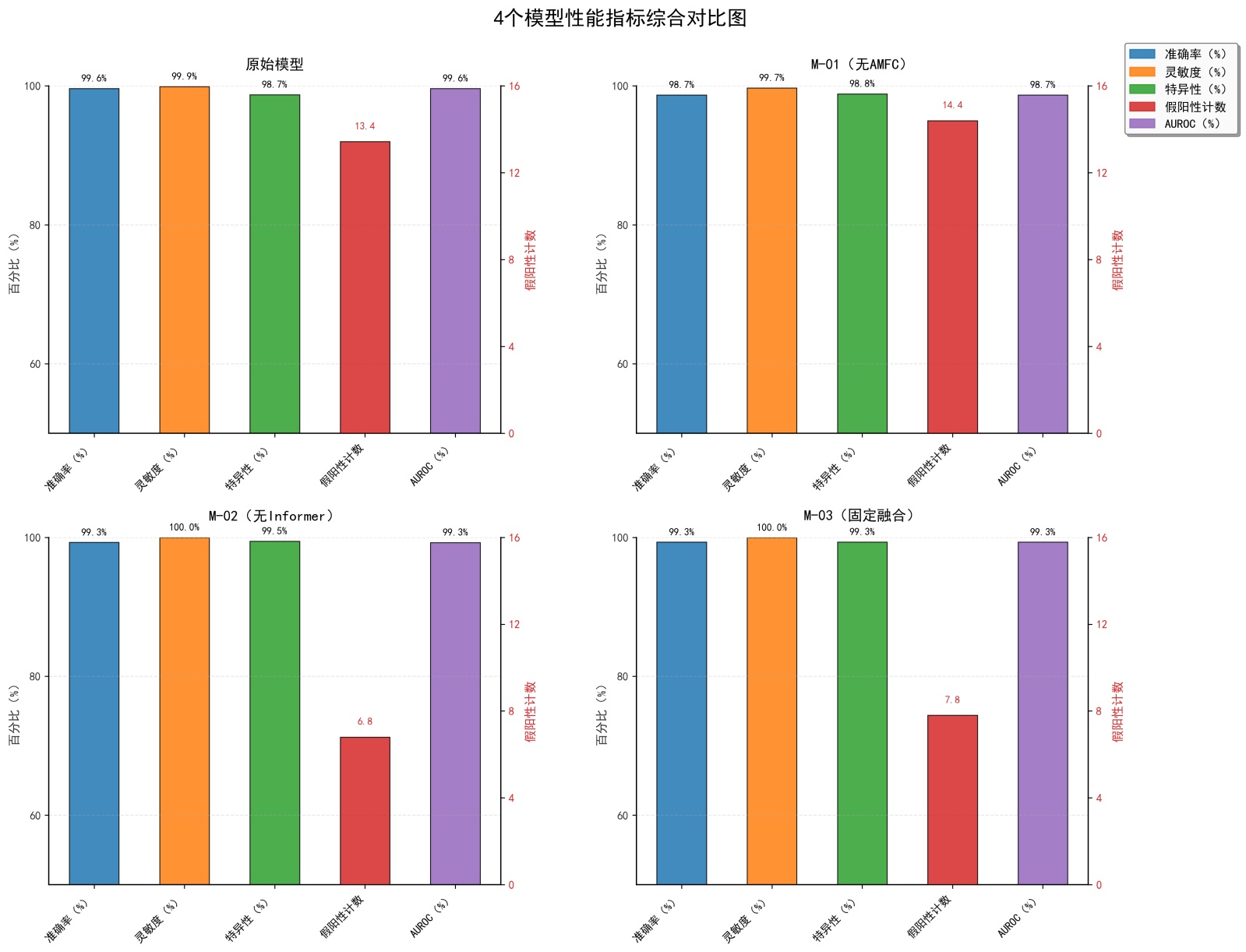 图4从左至右、从上至下分别展示了准确率、灵敏度、特异性、假阳性计数及AUROC的量化对比:蓝色柱状图代表原始模型,其他颜色柱状图分别对应三组消融变体。可以清晰观察到,原始模型在准确率、灵敏度及AUROC上均表现最优,而移除任一核心组件后指标均出现不同程度下降,尤其M-01 (无AMFC分支)的性能衰减最为显著,直观验证了AMFC分支、Informer分支及动态加权融合策略对模型性能的协同增益作用,与表6的定量分析结果一致。