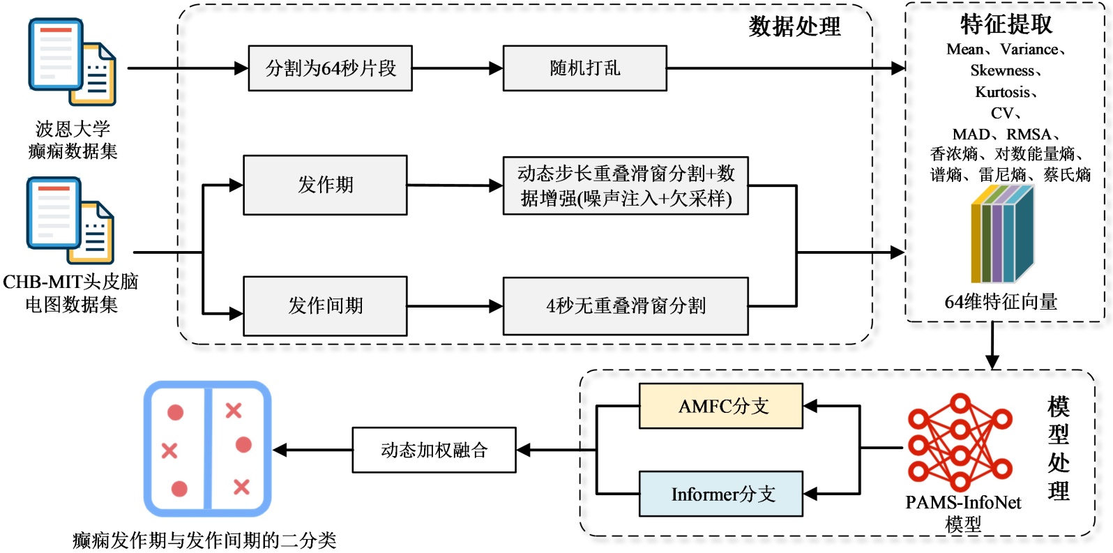 图1为本文方法流程图,清晰展示了PAMFC-InfoNet模型用于癫痫发作检测的完整过程,主要包含数据输入、预处理、双分支特征提取、动态加权融合及分类输出五个核心环节。首先,输入单通道或多通道EEG原始信号;随后通过数据预处理(如滑窗分割、噪声增强、类别平衡处理)生成标准化样本;接着,AMFC分支聚焦局部细微特征(尖波/棘波)提取,Informer分支专注长程时序依赖建模;借助动态加权融合策略自适应整合双分支特征;最终经分类网络输出发作期/发作间期的检测结果,为临床癫痫自动检测提供端到端的解决方案。