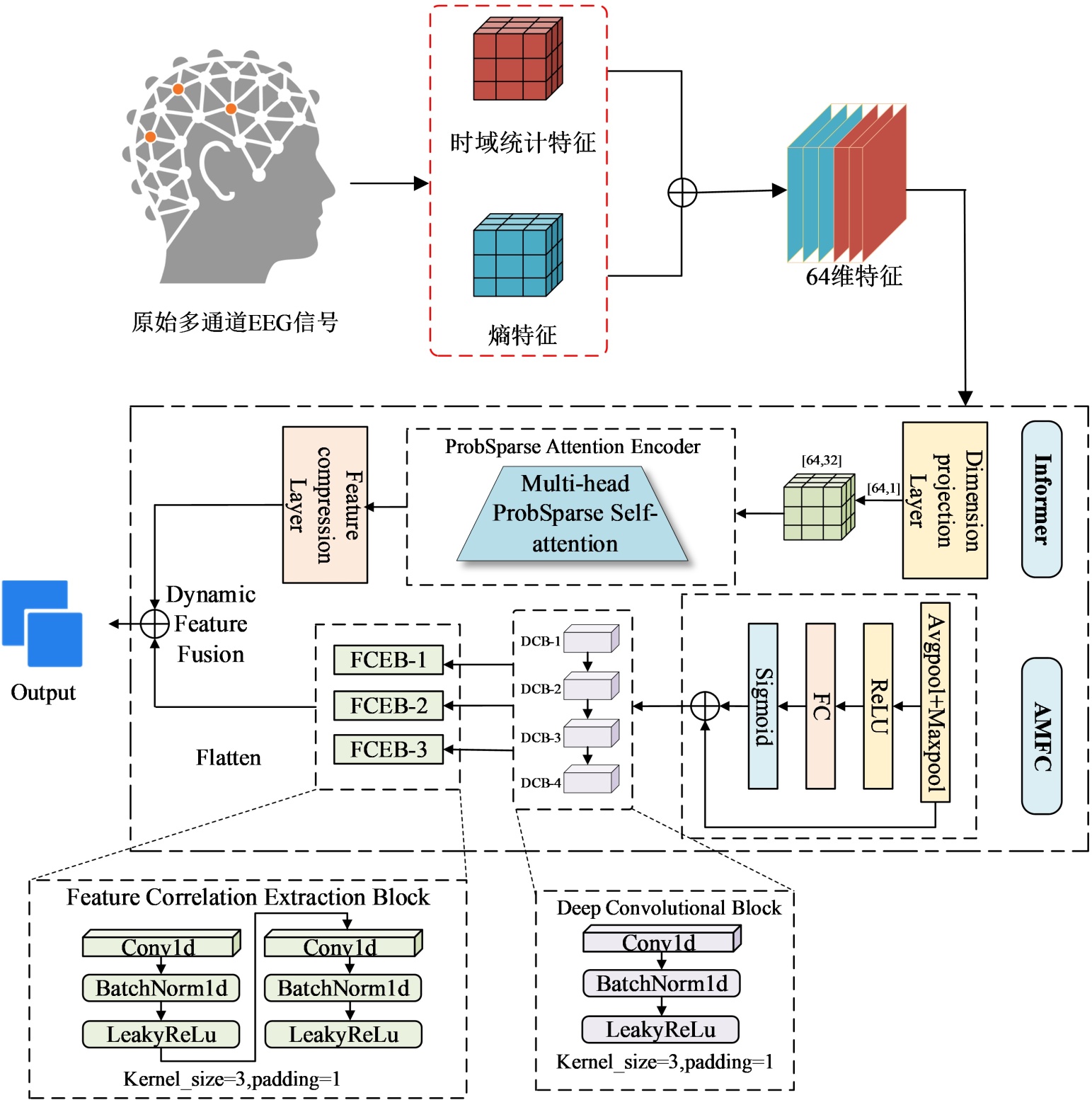 PAMFC-InfoNet模型的主要优势在于其双分支架构结合动态特征自适应融合,使得模型能够有效地从EEG信号中提取局部和全局特征。AMFC分支通过多尺度卷积和注意力机制增强局部特征提取,而Informer分支则专注于捕捉长程时序依赖。两者的结合使得模型能够超越传统的单分支模型,因为这些模型往往难以同时抓取时序上的长期依赖和局部特征。