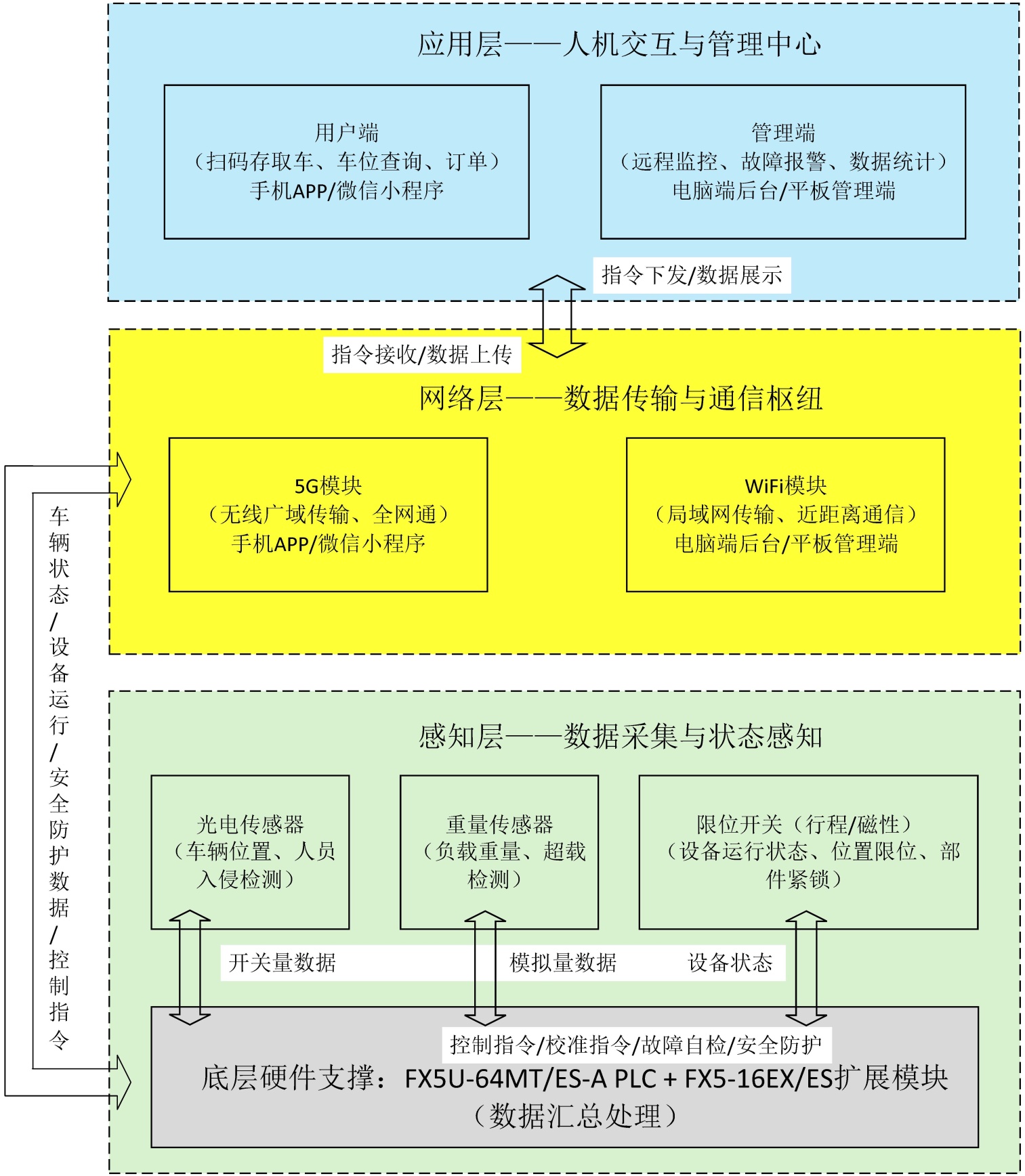 本系统采用感知层–网络层–应用层三层物联网架构设计,底层以PLC为数据汇总核心,通过光电传感器、重量传感器、限位开关完成车辆位置、负载重量、设备运行状态等数据的精准采集;中层采用4G + Wi-Fi双模块实现数据无线传输,保障网络冗余与传输稳定性;顶层分为用户端与管理端,分别实现扫码存取车等用户交互功能和远程监控、故障报警等运维管理功能,三层架构形成“采集–传输–应用–指令反馈”的完整闭环,实现车库的自动化与智能化运行。系统架构图如图7所示。