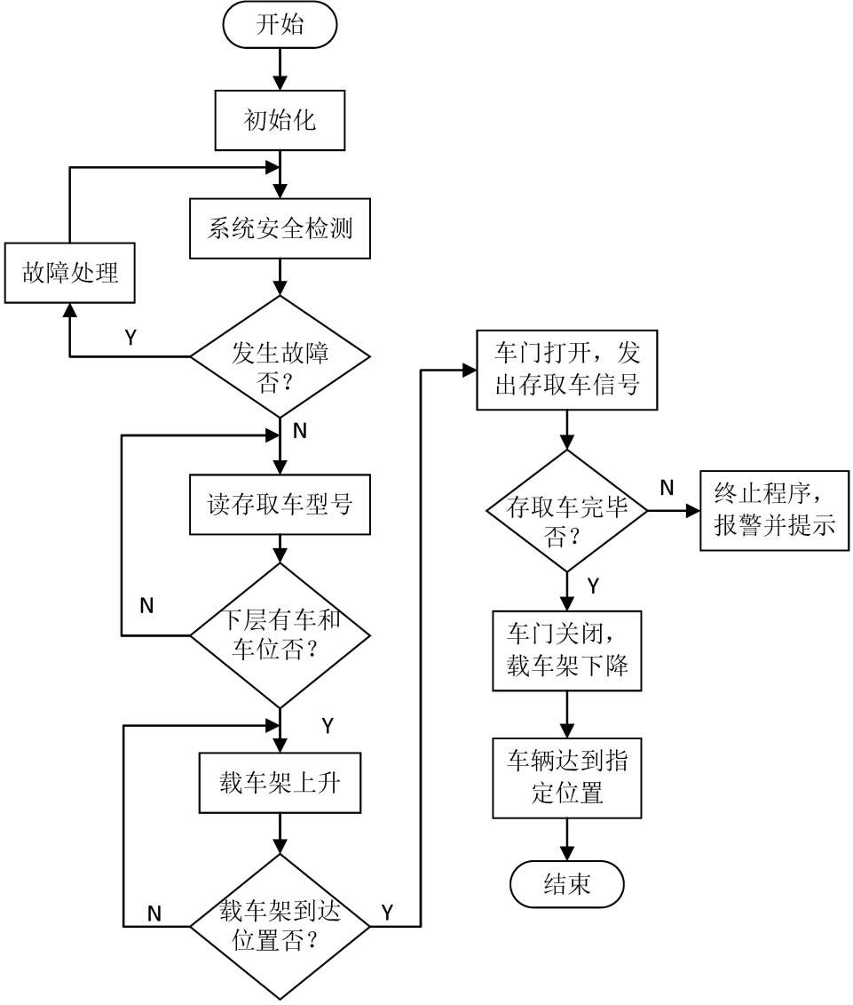 系统设置了存取车流程,控制流程始于安全状态自检,确认无故障后启动车位分配逻辑:优先使用第一层空位;若第一层满载,则调度第二层空闲载车板下降至第一层,原第一层空位作为下降缓冲空间。车辆就位后,载车板自动提升至第二层完成存车。