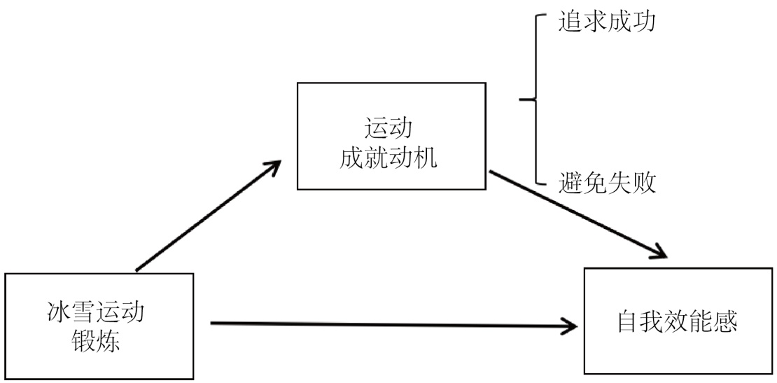 因此,从冰雪运动锻炼的视角出发,系统探讨运动成就动机对青少年儿童自我效能感的影响机制,不仅有助于深化对青少年儿童参与冰雪运动心理动因的理解,而且能够为提升其自我效能感、增强持续参与冰雪运动锻炼的内在动力提供实证依据。在此基础上,相关研究结论可为优化冰雪运动推广策略、设计更具针对性的青少年儿童冰雪运动干预方案提供重要的实践启示,从而对促进青少年儿童广泛而持续地参与冰雪运动锻炼产生积极推动作用。假设模型如图1所示。