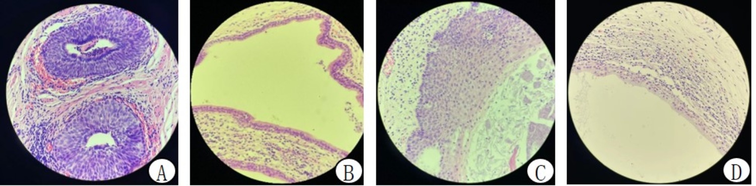 注:HE,×40 A病例1窦道内衬复层鳞状上皮、部分类似尿道上皮;B病例2窦道内衬复层鳞状上皮、单层粘液上皮、复层柱状上皮;C病例3窦道内衬复层鳞状上皮;D病例4窦道内衬柱状上皮及鳞状上皮。