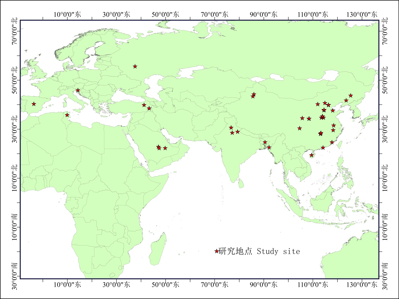 根据上述关键词共检索出616篇文献,其中中文320篇、英文296篇。基于纳入标准进一步筛选,得到52篇文献,其中中文30篇、英文22篇。根据这52篇文献整理出286条数据、8484个数据点。数据集中包括全球48个研究地点,研究数据点均取自文献中的表格、文本和图片,图片数据采用Getdata Graph Digitizer (http://www.getdatagraph-digitizer.com/index.php)软件识别获取。将采集的试验点的地理坐标(WGS 1984地理坐标系)进行标准化处理,随后在ArcMap10.2平台中通过“Display XY Data”功能将经纬度数据转换为矢量点图层。通过配准世界地图进行空间可视化,所有采样点的地理分布展示在图1中。在已发表文献中提取土壤物理性质和水质相关变量的平均值、样本量和标准误/标准偏差,并据SD = SE × n0.5 (n为样本量)将数据的标准误(standard error, SE)转化为标准差(standard deviation, SD);若原始报告中存在数据缺失,未明确给出标准差或标准误,且数据重复数大于3,则使用平均值的10%来估计相应的SD值。