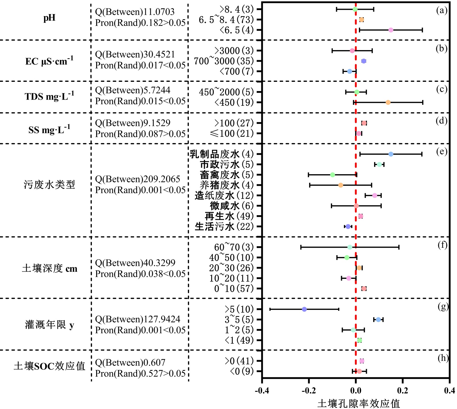 由图3(c)可知,不同TDS组的组间异质性达到了显著水平(P = 0.015 < 0.05),但两组的95%置信区间均与无效线(效应值 = 0)相交,因此在统计学上与清水组对土壤孔隙率的影响无显著差异。如图3(b)所示,EC组间表现出较高的异质性(Q(Between) = 30.45),且达到了统计学上的显著水平(P = 0.017 < 0.05),表明EC是影响土壤孔隙率的一个关键因素。在当前数据集范围内,发现采用EC为700~3000 μS·cm−1的污废水进行灌溉,对土壤孔隙率产生了显著的正向效应,相对于清水组增加了2.64%~4.17%,这可能与特定盐分浓度影响土壤团聚体结构有关;该组包含了绝大多数研究样本(n = 35),结果较为稳健。而较低EC (<700 μS·cm−1)与较高EC (>3000 μS·cm−1)两组的95%置信区间与无效线相交,表明该负面影响未达到统计学显著性,且由于该两组样本量较小,其效应的不确定性较大。