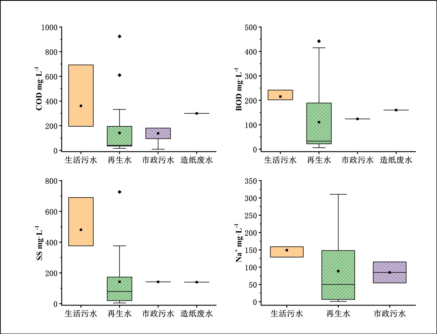 图4. 生活污水、再生水、市政污水和造纸废水中COD、BOD、SS和Na+浓度箱线图比较