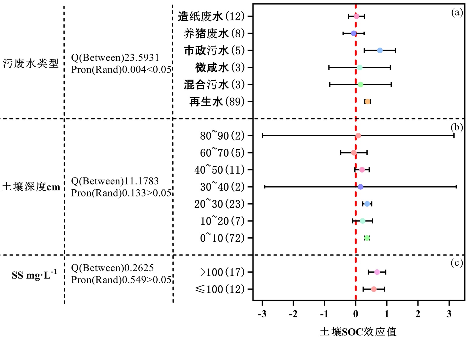 图5. 污废水灌溉对土壤SOC的影响(纵轴括号内数值为样本量)