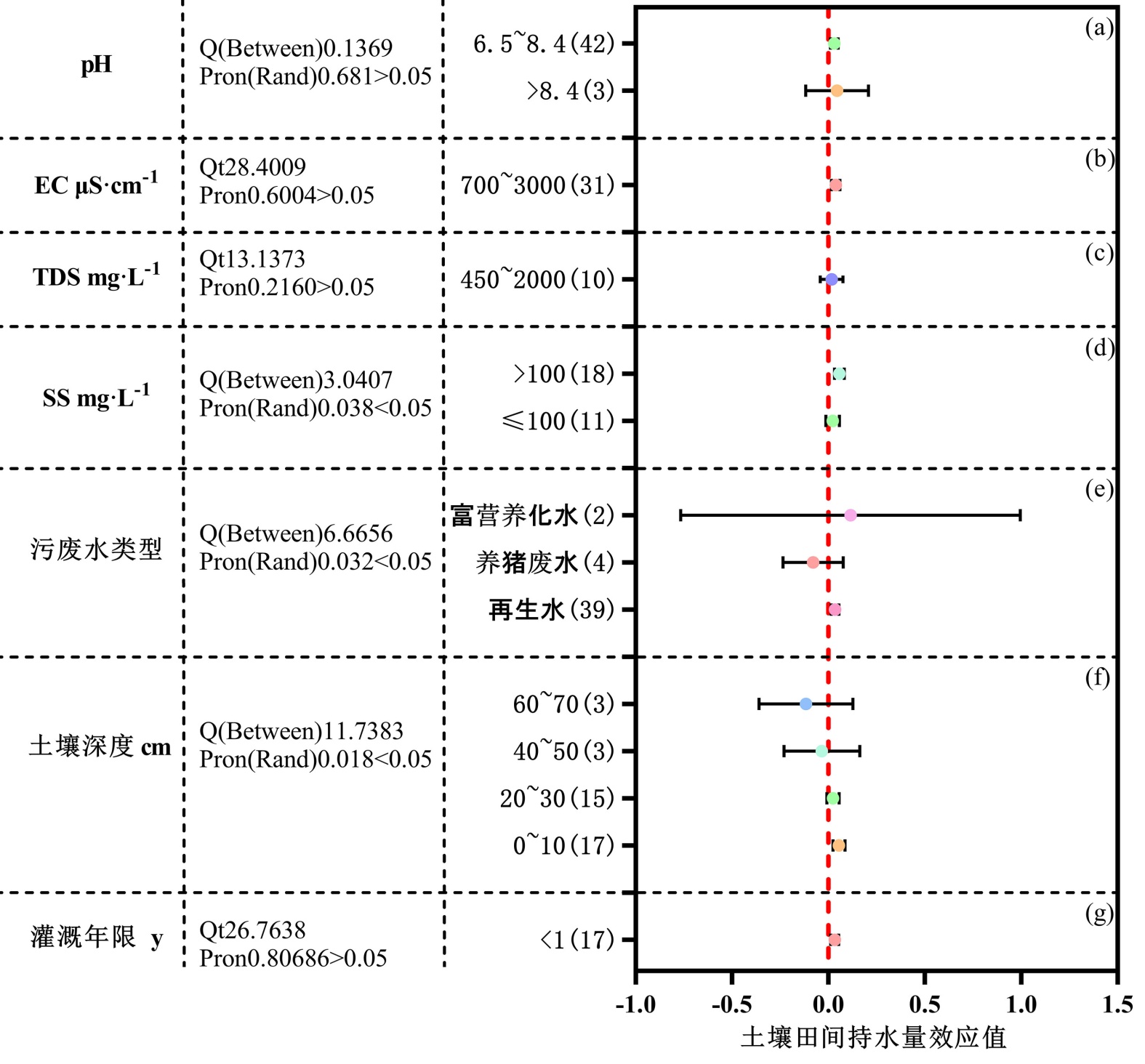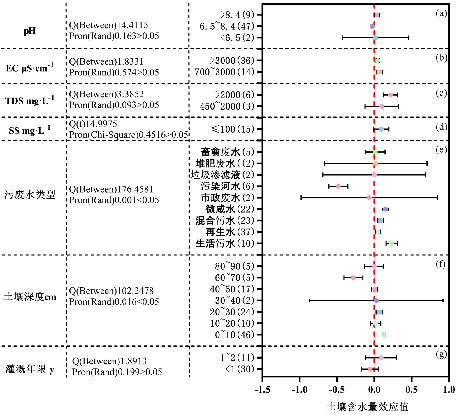 对污废水类型的影响及灌溉后不同深度土壤的含水量进行分析发现,二者的组间异质性均较高,Q(Between)分别为176.45和102.24。由图7(e)可知,在本数据集所涵盖的样本中,生活污水、再生水、混合污水(再生水 + 微咸水)、微咸水对土壤含水量产生了显著的正向效应,其中生活污水最为显著,可使土壤含水量提升23.33%。这可能是因为生活污水灌溉会堵塞大孔隙并破坏土壤团聚体,导致土壤结构致密、透水性变差,但形成的小孔隙持水能力更强,因此土壤表层的含水量可能短期增加[22]。而受污染河水对土壤含水量却产生了显著的负向效应,使土壤含水量降低了48.28%。其余四种污废水类型(包括猪场废水、畜禽废水、苦咸水)的95%置信区间均与无效线(效应值 = 0)相交,表明其对土壤含水量的影响与清水灌溉在统计学上无显著差异。