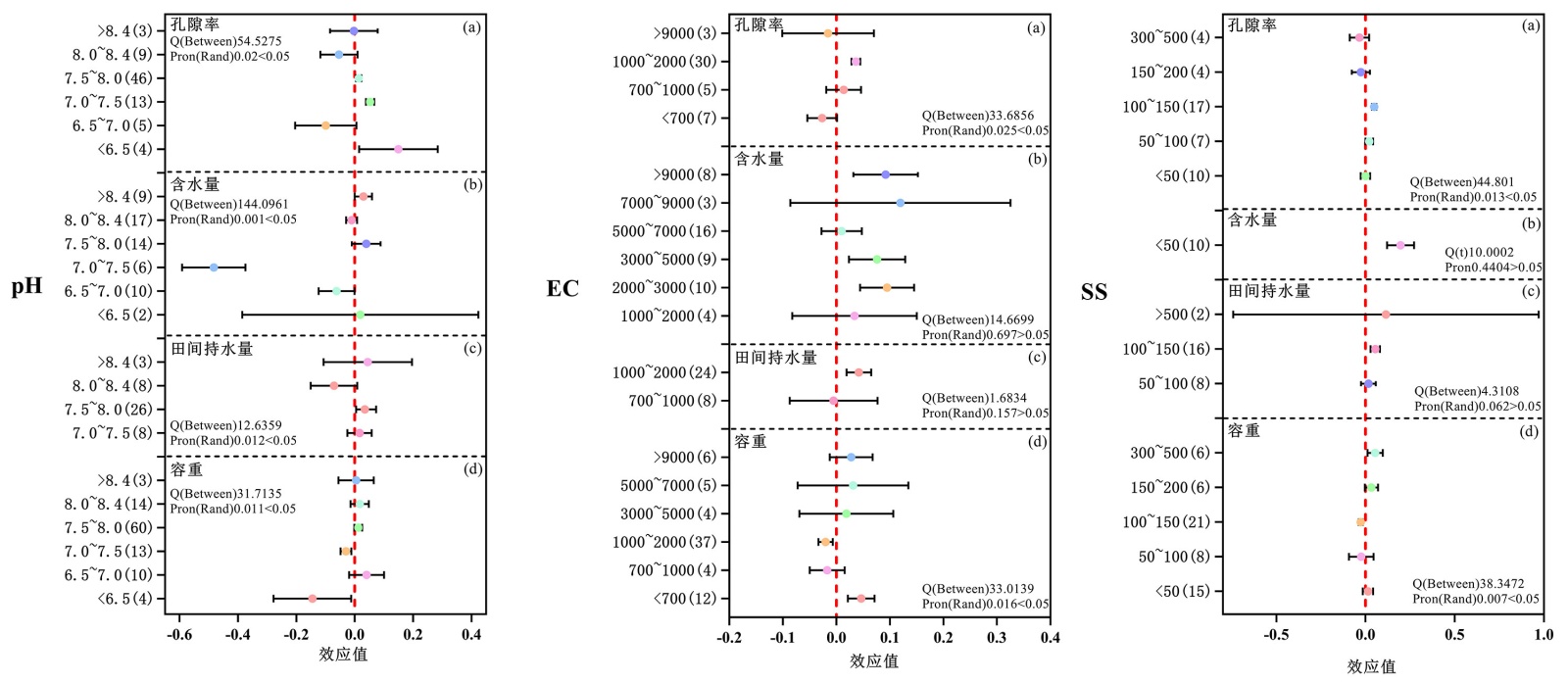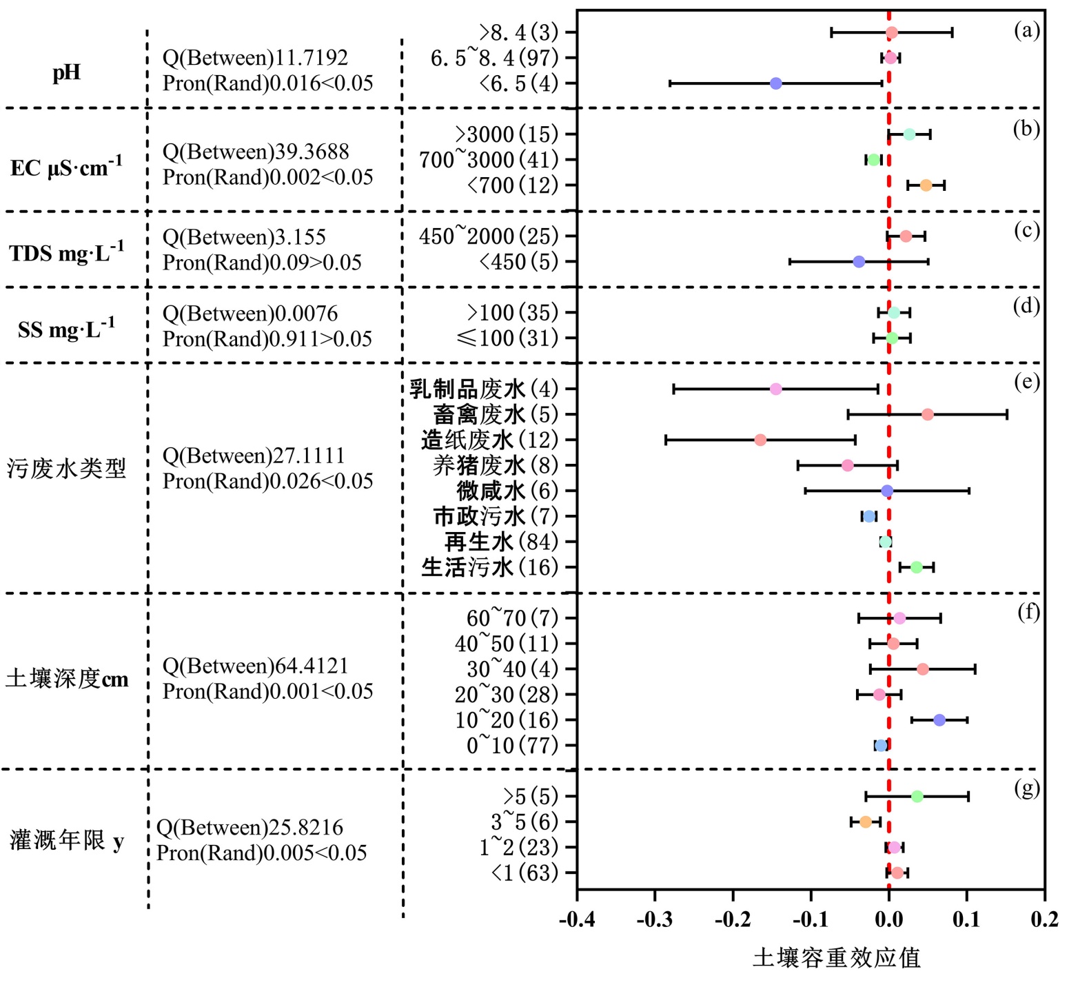 土壤容重是衡量土壤松密程度与结构的关键指标。高容重意味着土壤紧实、孔隙少,会严重阻碍水分渗透、空气流通和根系下扎,是土壤退化和限制植物生长的主要物理成因。而低容重使土壤疏松多孔,显著改善通气透水性,促进根系生长,是理想的土壤物理结构[26]。因此,本研究考察了灌溉用污废水的pH、EC、TDS和SS对土壤容重的影响,结果如图8所示。pH和EC的组间异质性较高,表明其分组均对土壤容重产生了不同程度的影响。而TDS与SS则组间异质性较低,说明其对土壤容重的影响未达到统计学显著性水平,TDS和SS可能不是调控土壤容重变化的关键因素。