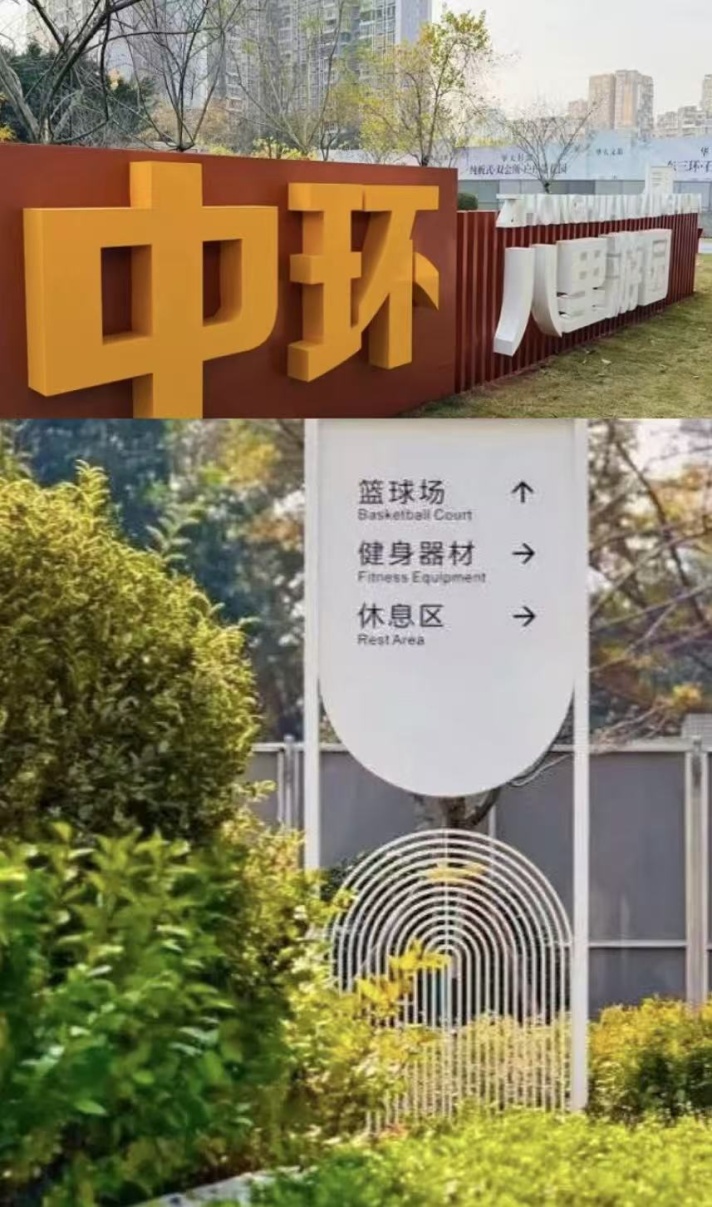 中环八里游园位于成华区中环路八里庄路段南侧,紧邻地质花园小区,面积约3200平方米,改造前为城市建设遗留地块与临时停车场地。成华区城市更新局采用“功能模块化 + 工业文化植入”的改造模式,在公园内配置标准三人制篮球场、智能健身器材群和生态步道系统,构建起“运动 + 休憩 + 生态”的复合功能模块。同时,设计融入工业记忆元素的休憩区,背景墙运用金属锈板、水泥方孔砖、格栅等材料,打造富有“铁轨风”造型感的公园空间。该项目是《成都市国土空间总体规划(2021~2035年)》批复后,成华区首个严格按照“详细规划定落实”原则实施的社区级口袋公园项目。在规划层面通过控规用地性质微调(由防护绿地调整为社区公园绿地)和容积率异地补偿机制,为高密度建成区工业遗存边角地的“针灸式更新”提供了实践案例。