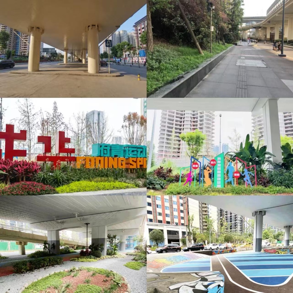 成华府青运动空间改造前为典型的“城市灰色低效空间”,位于成华区府青路三段立交桥下方,原为高架桥投影区及桥墩间隙空间。该地块土地权属复杂,涉及市政道路用地、绿化带、周边社区边界模糊地块等。针对其环境脏乱、功能单一与社会负面评价多等低效表现,该地采用了政企社协同的“功能模块化激活”的改造模式。