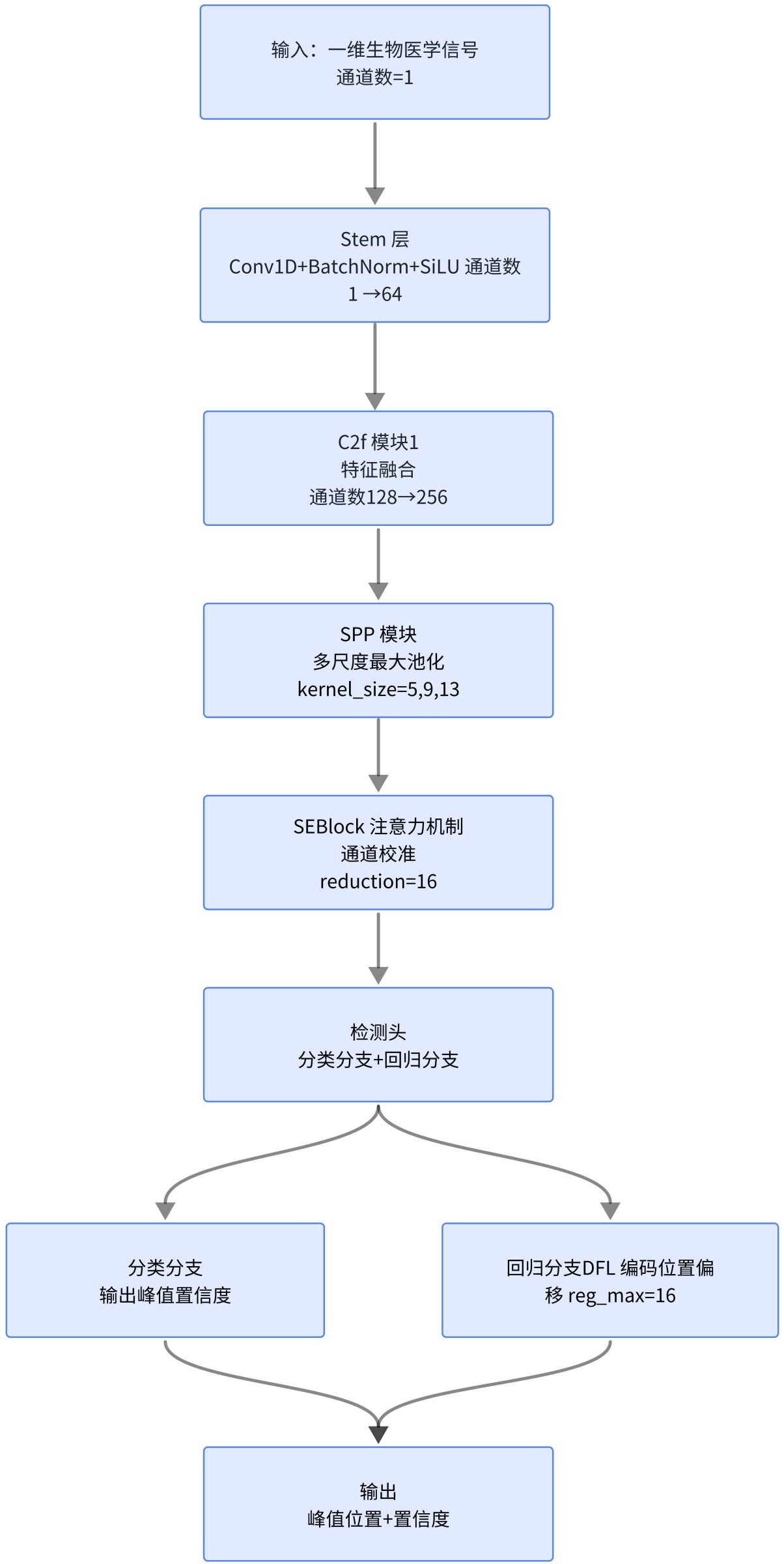 YOLO-1D架构的整体设计如图1所示:输入为一维生物医学信号,经特征提取骨干网络处理后,由检测头输出峰值位置及其置信度。网络结构包含Stem层、C2f模块、SPP模块、SEBlock注意力机制以及检测头。Stem层由一维卷积(Conv1D)、批归一化(Batch Normalization)和SiLU激活函数构成,执行初始特征提取,将输入信号通道数从1扩展至64。C2f模块作为YOLOv8的核心组件,通过特征融合增强网络表达能力;本架构包含两个C2f层,分别将通道数从64扩展至128和256。SPP模块通过不同尺度(卷积核尺寸kernel_size = 5, 9, 13)的最大池化操作提取多尺度特征。SEBlock采用通道注意力机制,自适应地重新校准通道特征响应(缩减因子reduction=16)。检测头包含分类分支与回归分支:分类分支输出各位置为峰值的概率;回归分支输出峰值位置的精确偏移量(采用DFL编码,reg_max = 16)。