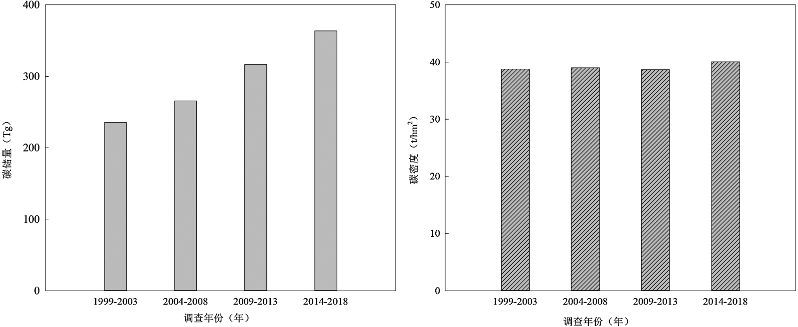 图1. 黄河流域各时期森林植被碳储量、碳密度