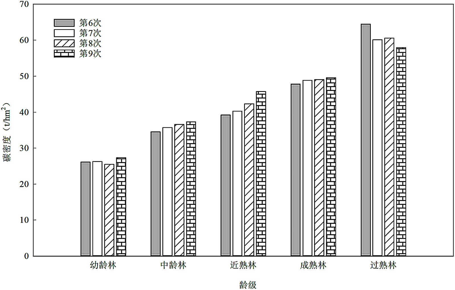 Figure 3. Carbon density of forest stands by age class in the Yellow River Basin