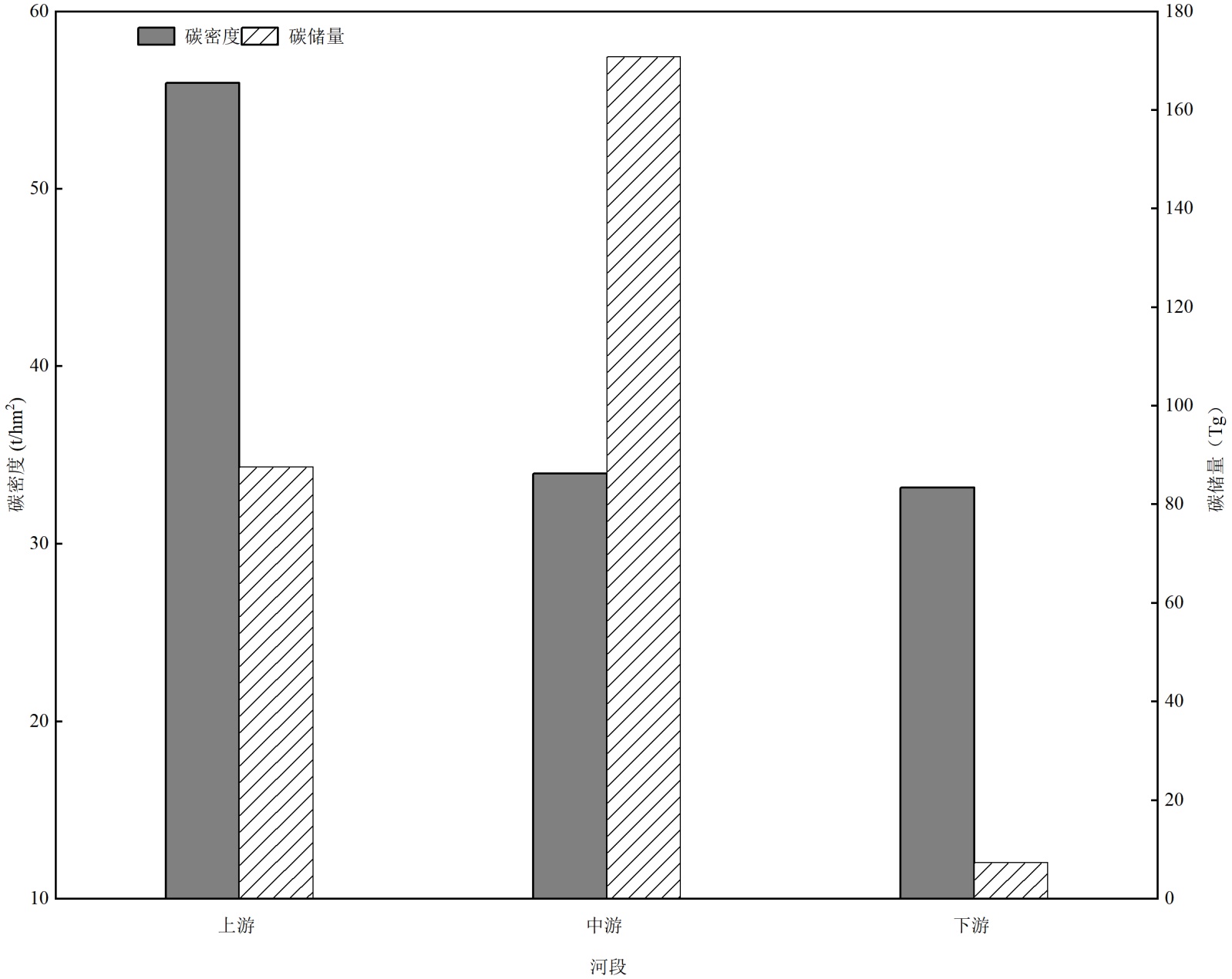 4) 黄河上游河段碳密度大于中游河段,但是上游河段总碳储量低于中游河段,下游河段碳储量最小。