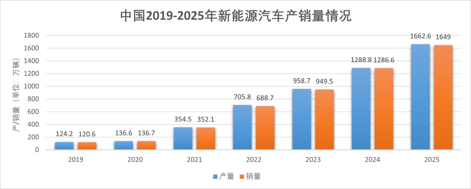 随着全球气候变化问题的加剧、全球低碳转型和我国“碳达峰”“碳中和”双碳政策的不断推进,新能源汽车(New Energy Vehicles, NEV)已经成为各国政府和企业应对环境挑战的过程中的关键战略支点。近年来,在相关政策支持下,我国的新能源汽车产业发展迅速,新能源汽车大国优势持续凸显。如图1所示,根据中国汽车工业协会统计数据,2025年,国内新能源汽车产销量分别达到1662.6万辆和1649万辆,同比分别增长29%和28.2%,市场渗透率达到47.9%。预计到2026年,这一势头仍将延续,新能源汽车销量将进一步攀升,并有望达到1900万辆,继续巩固中国作为全球最大新能源汽车消费市场的地位。在新能源汽车产业快速发展的背景下,动力电池作为核心动力源的重要性日益增强。作为新能源汽车的“心脏”,动力电池不仅提供车辆行驶所需的能量,也是推动全球能源结构转型的关键力量。随着技术的不断进步和市场需求的持续增长,动力电池行业正经历前所未有的变革与发展。