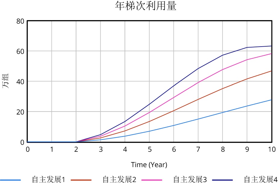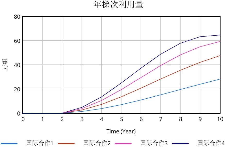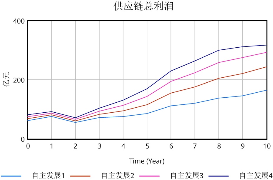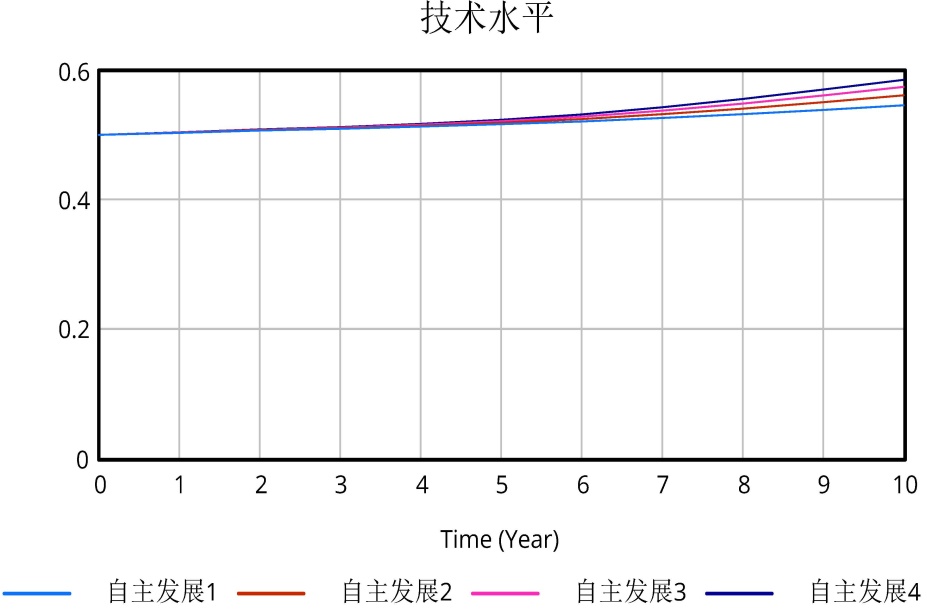 在自主发展情景下,供应链中的企业完全依靠自主研发,未与国外领先企业开展技术合作,即技术进步 = 自主研发速度,为了探究供应链内部协同效应,本文将纵向合作程度作为灵敏度分析的关键变量,分别设定为0.2、0.4、0.6和0.8共四个梯度,依次代表从极低到极高的合作水平,其仿真结果分别对应图5中的曲线1至4。