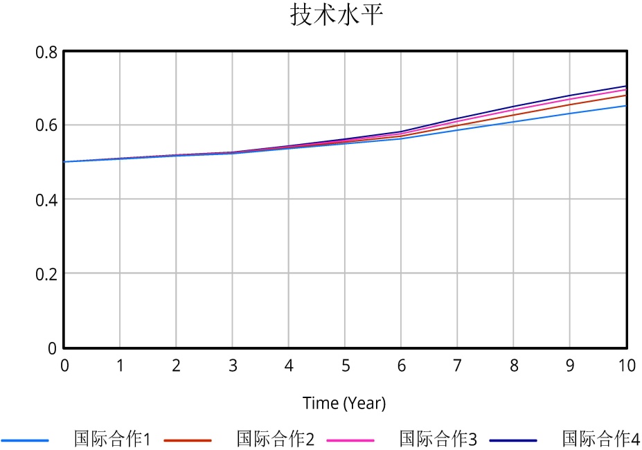 在国际合作情景下,动力电池闭环供应链企业积极寻求与国外优秀企业的合作。为了反映外部技术的动态演进过程,本文将变量国外先进技术设定为阶梯式增长函数,前3年为0.6,第3~6年为0.7,第6年后为0.8。同时,保持纵向合作程度的灵敏度参数与3.1节一致,即0.2、0.4、0.6、0.8共四个梯度,其仿真结果分别对应图6中的曲线1至4。在此情景下,如图所示,纵向合作程度对技术水平产生了显著