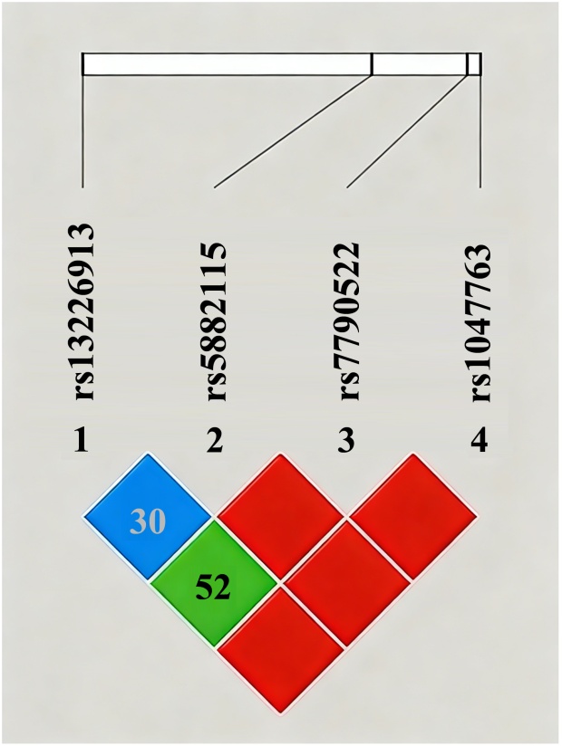 图2. C1GALT1基因4个SNP位点连锁不平衡分析