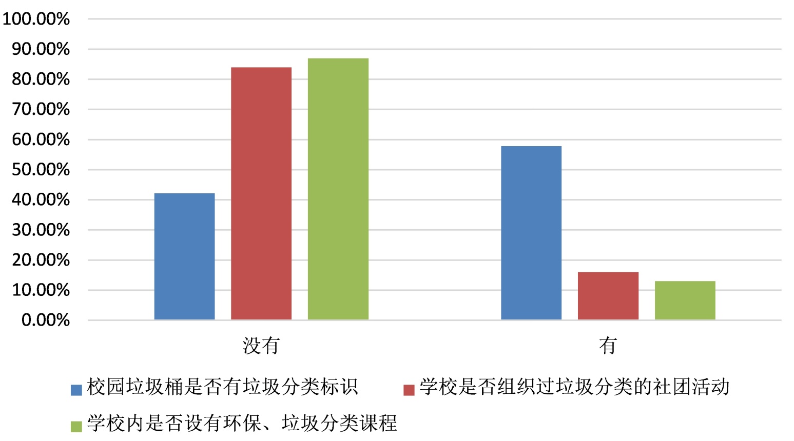 调查显示,当前高校在垃圾分类的配套支持存在明显不足:约84%的学校未组织过相关社团活动,16%的高校有“组织过”。87%未开设分类课程。很多高校并没有把垃圾分类设置成课程。49%的学生因“不会分”而混装丢弃,凸显“有意识、无能力”的困境,42%的校园未配备分类标识垃圾桶。如图2校园垃圾分类设施调查所示。这表明,政策、设施与学生行为三者紧密关联。高校需通过课程设置、设施完善与活动引导等系统性措施,提升学生的分类能力,以实现环保意识向有效行动的转化。