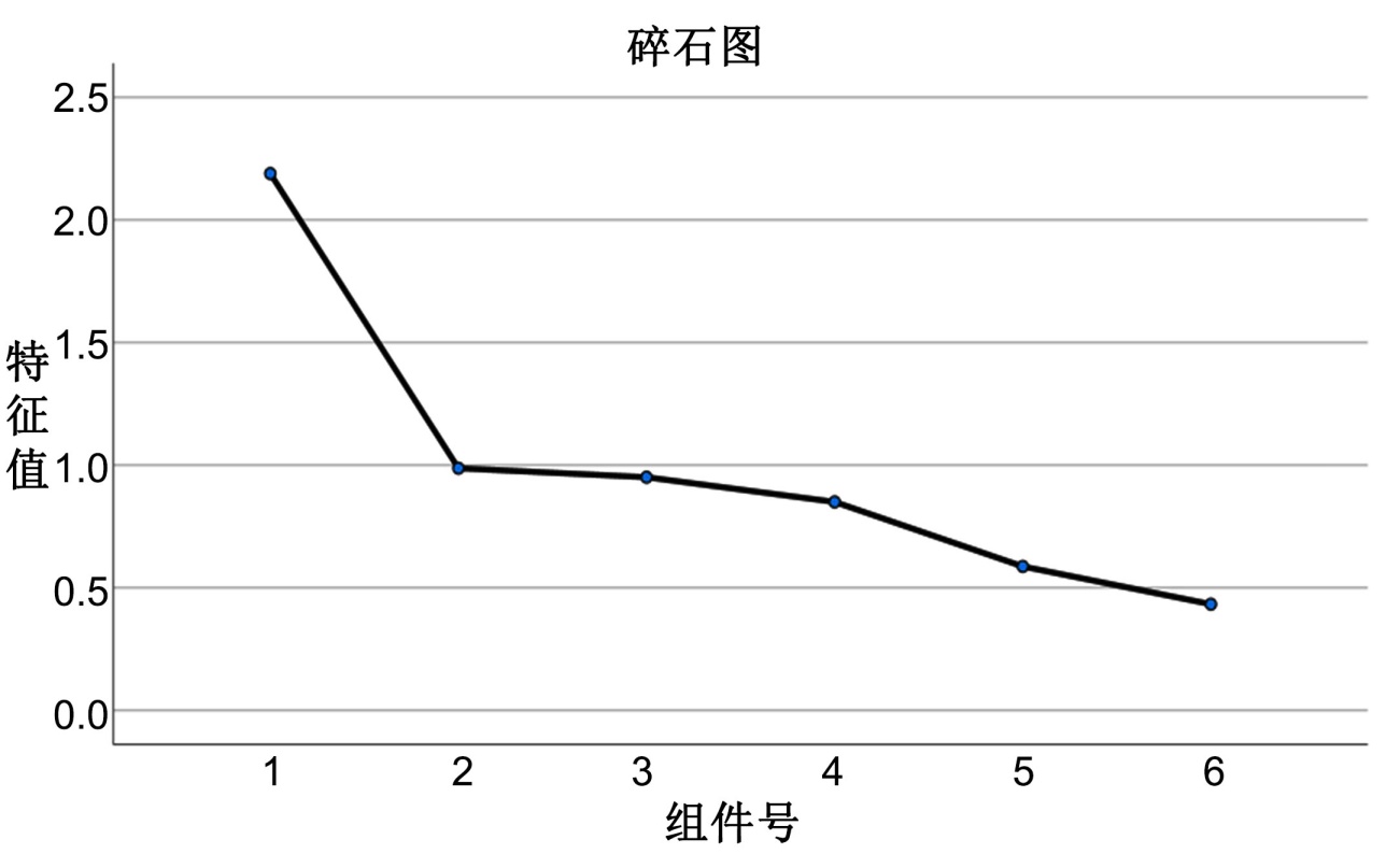此例中,第一主成分与第二和第五个变量的相关系数接近1,说明它主要涵盖了这两个变量的信息,可以命名为“源头引导与末端管控失衡”,反应管理脱节问题,第二个主成分与第三个变量的相关系数接近1,说明它主要涵盖了这一个变量的信息,命名为“政策不完善,管理存在空白区”,聚焦制度缺失;第三个主成分与第六个变量的相关系数接近1,说明它主要涵盖了这一个变量的信息,命名为“相关知识学习少,不会分类投放”,指向教育短板;第四个主成分与第一个变量的相关系数接近1,说明它主要涵盖了这一个变量的信息,命名为“垃圾末端处置技术差,麻烦大于成效”,关联处置成本与效率。