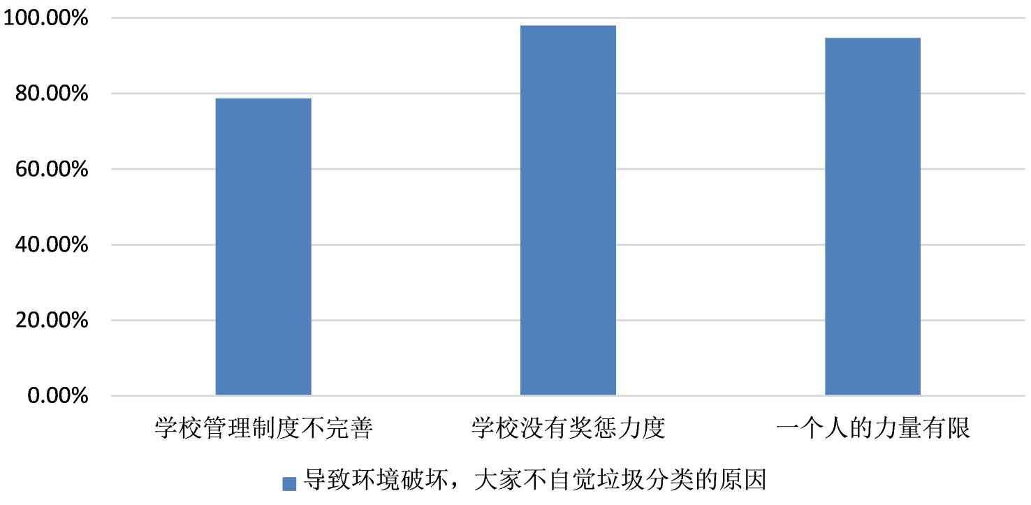 第三主成分揭示了“政策不完善,管理存在空白区”是影响垃圾分类的关键。根据调查问卷结果显示,约79%的学生认为高校管理制度不健全是主要障碍。约98%的学生认为奖惩力度不大所以分类效果甚微,94%的学生认为无所谓,自己一个人的力量有限。现有政策多为原则性倡议,缺少明确的奖惩细则与考核机制,导致执行效果不佳。监管责任主体不清晰,投诉渠道分散,难以形成有效的闭环管理。如图5意愿调查结果图所示。